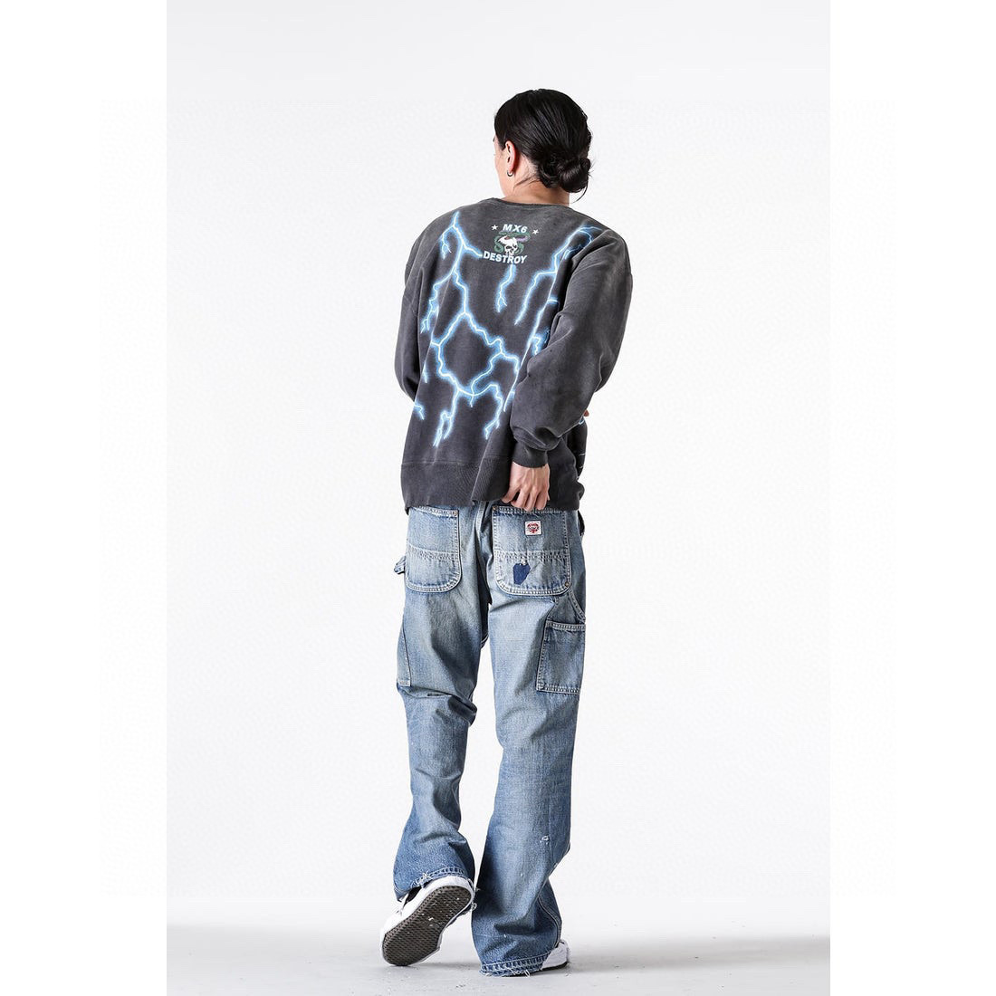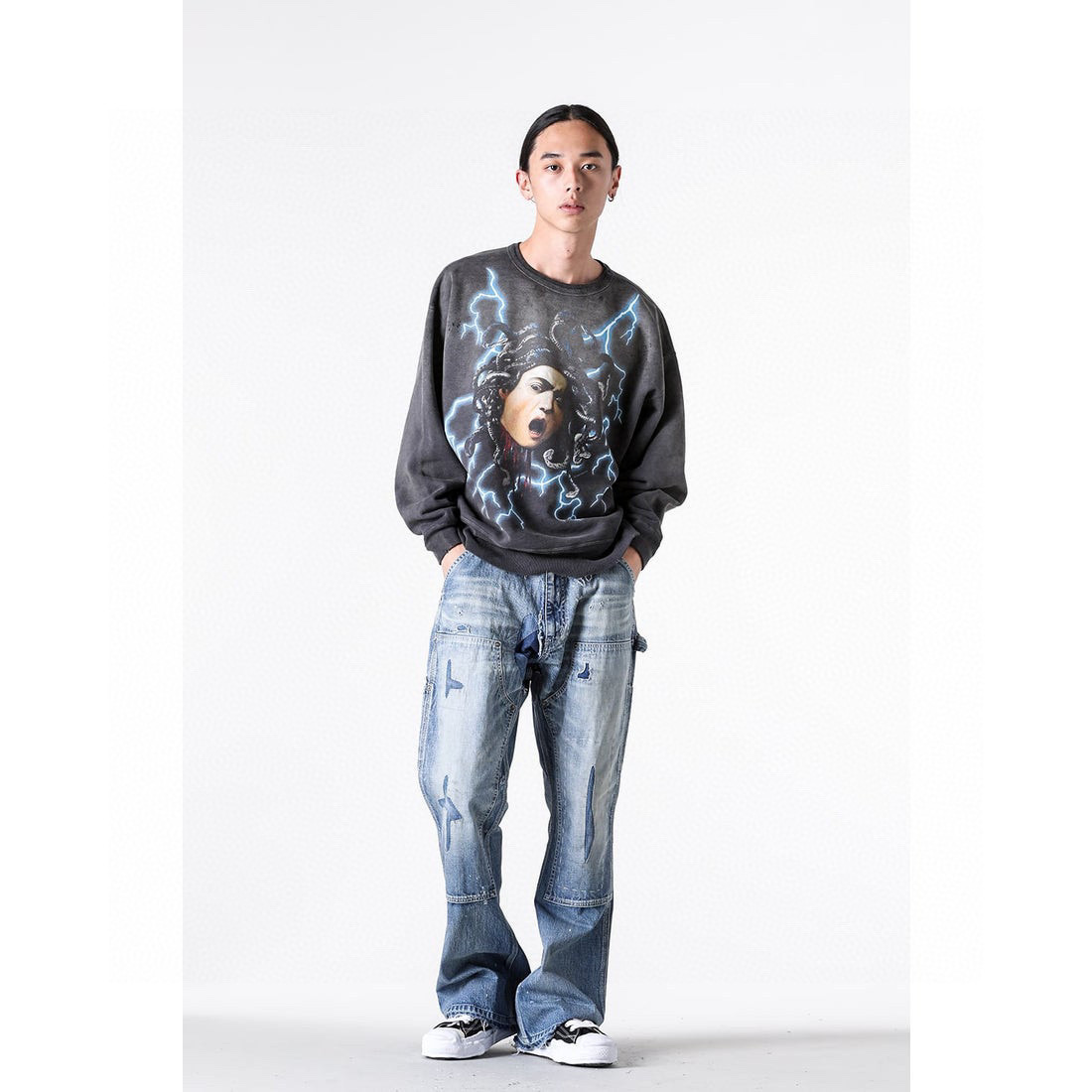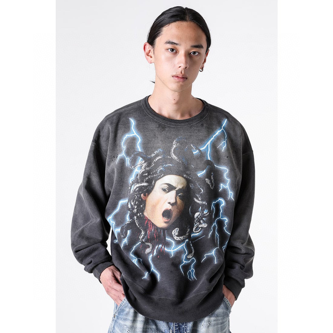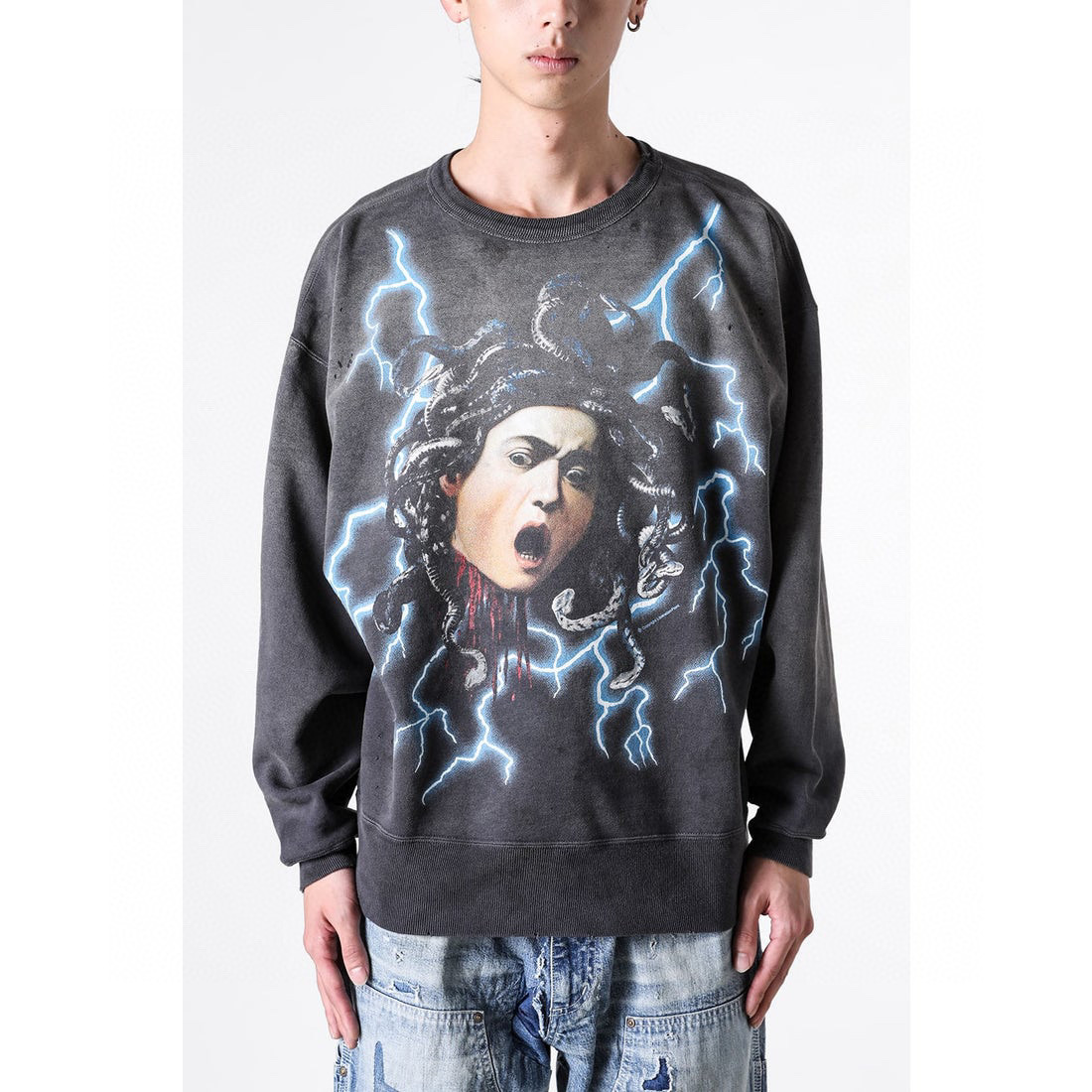 The Saint Michael Medusa Lightning Graphic Crewneck Sweatshirt captures the clash of mythology and modern rebellion through powerful visual storytelling. The front features a haunting graphic of Medusa’s severed head, surrounded by electric blue lightning bolts, while the back showcases the bold “MX6 DESTROY” skull-wing emblem. Crafted from heavyweight fleece cotton, the piece is garment-washed for a naturally faded, distressed look. Laser-perforated holes add a raw punk attitude, and the oversized drop-shoulder cut delivers ultimate comfort and street presence. This sweatshirt is a standout piece for those who embrace art, chaos, and counterculture in their daily wear.