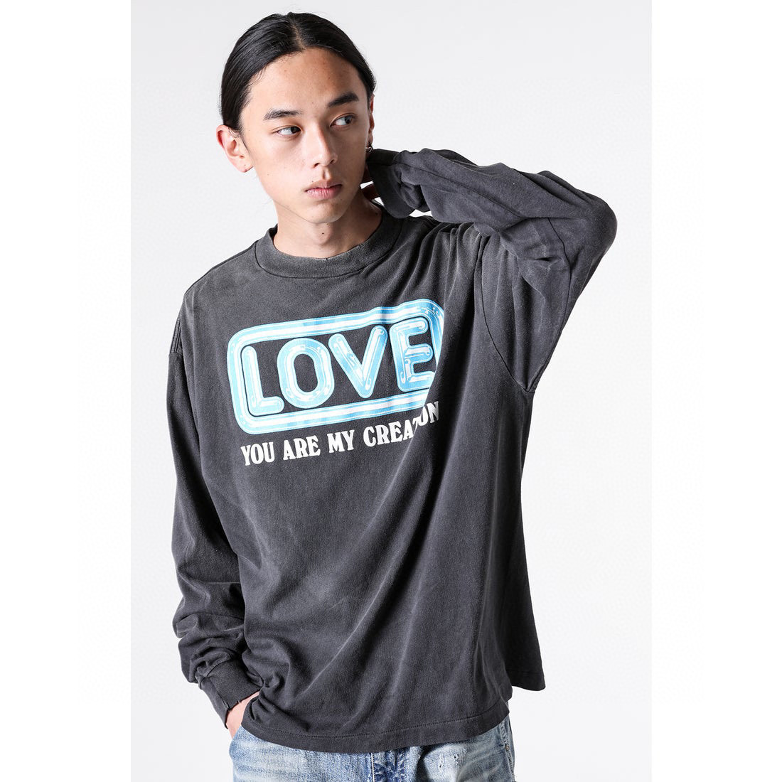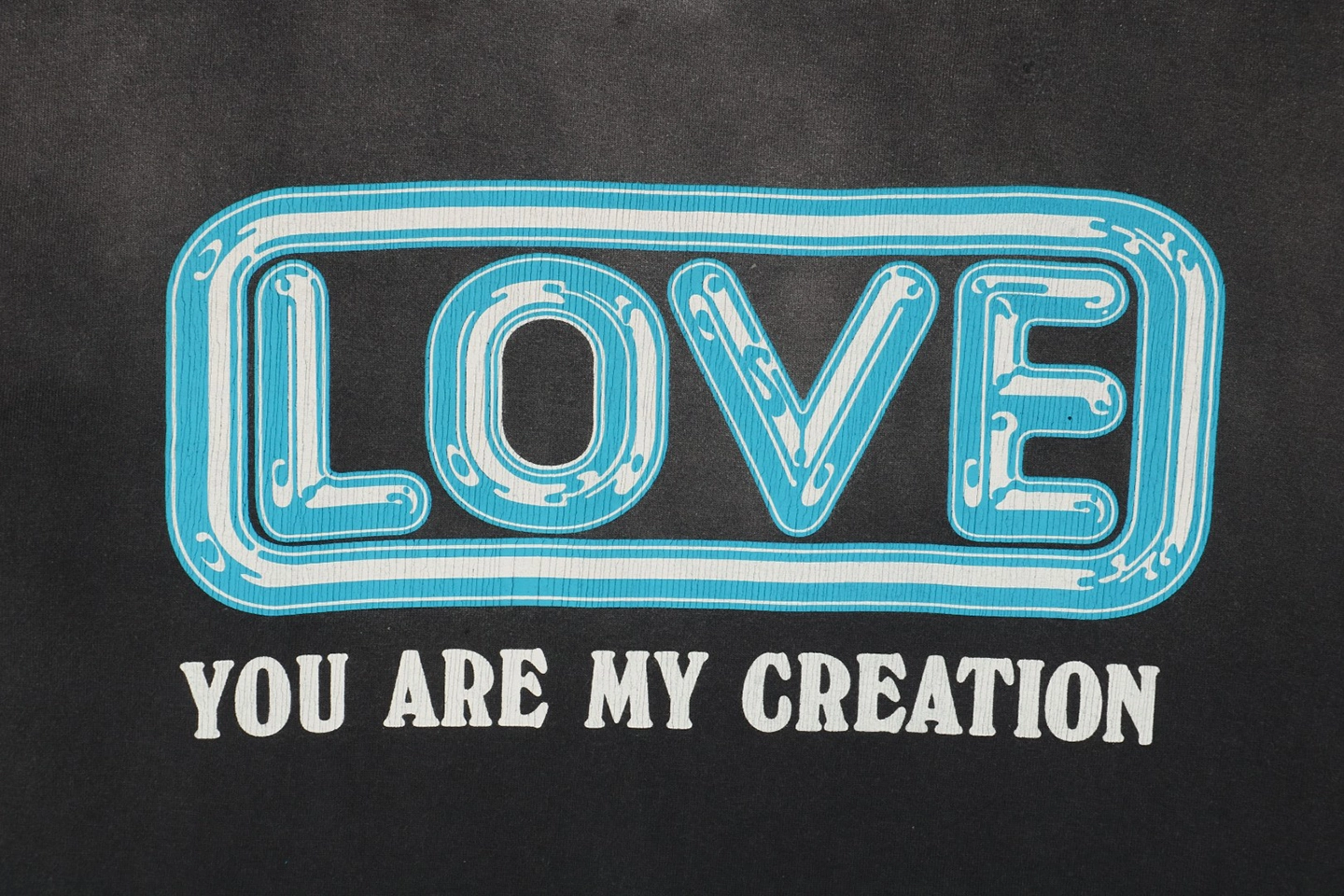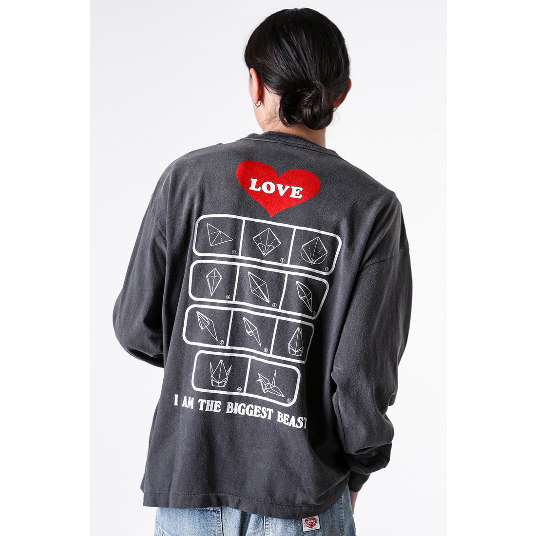 The Saint Michael Origami Love Heart Print Shirt delivers a playful yet philosophical message through its expressive front and back graphics. The front features a glowing neon-style “LOVE” with the phrase “YOU ARE MY CREATION”, while the back combines a red heart, step-by-step origami folding guides, and a bold proclamation — “I AM THE BIGGEST BEAST”. Crafted from premium cotton and treated with a vintage wash, this shirt captures both aesthetic edge and emotional storytelling in one piece.