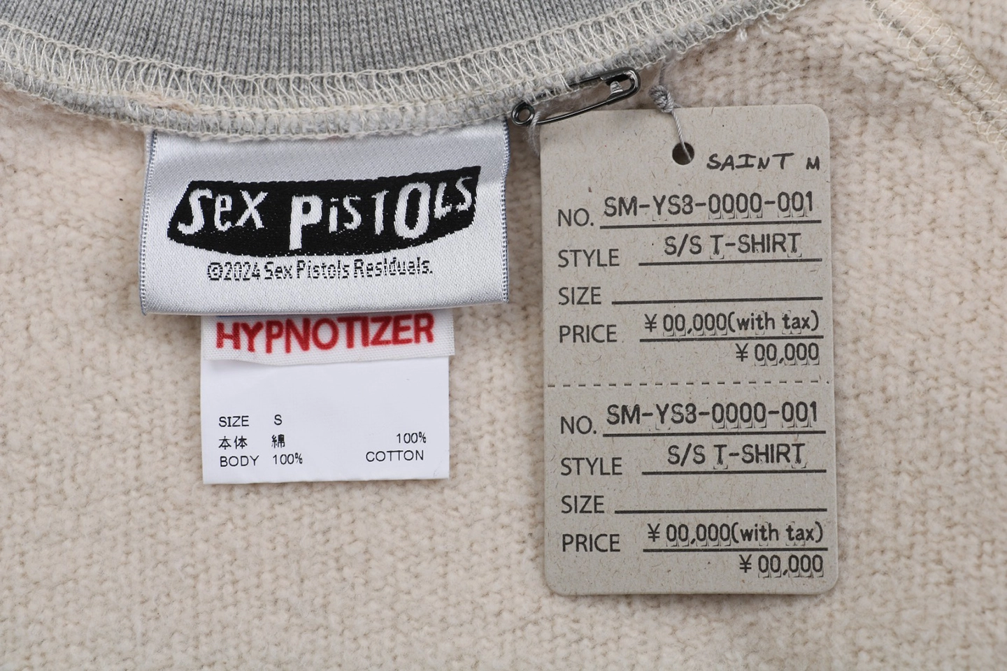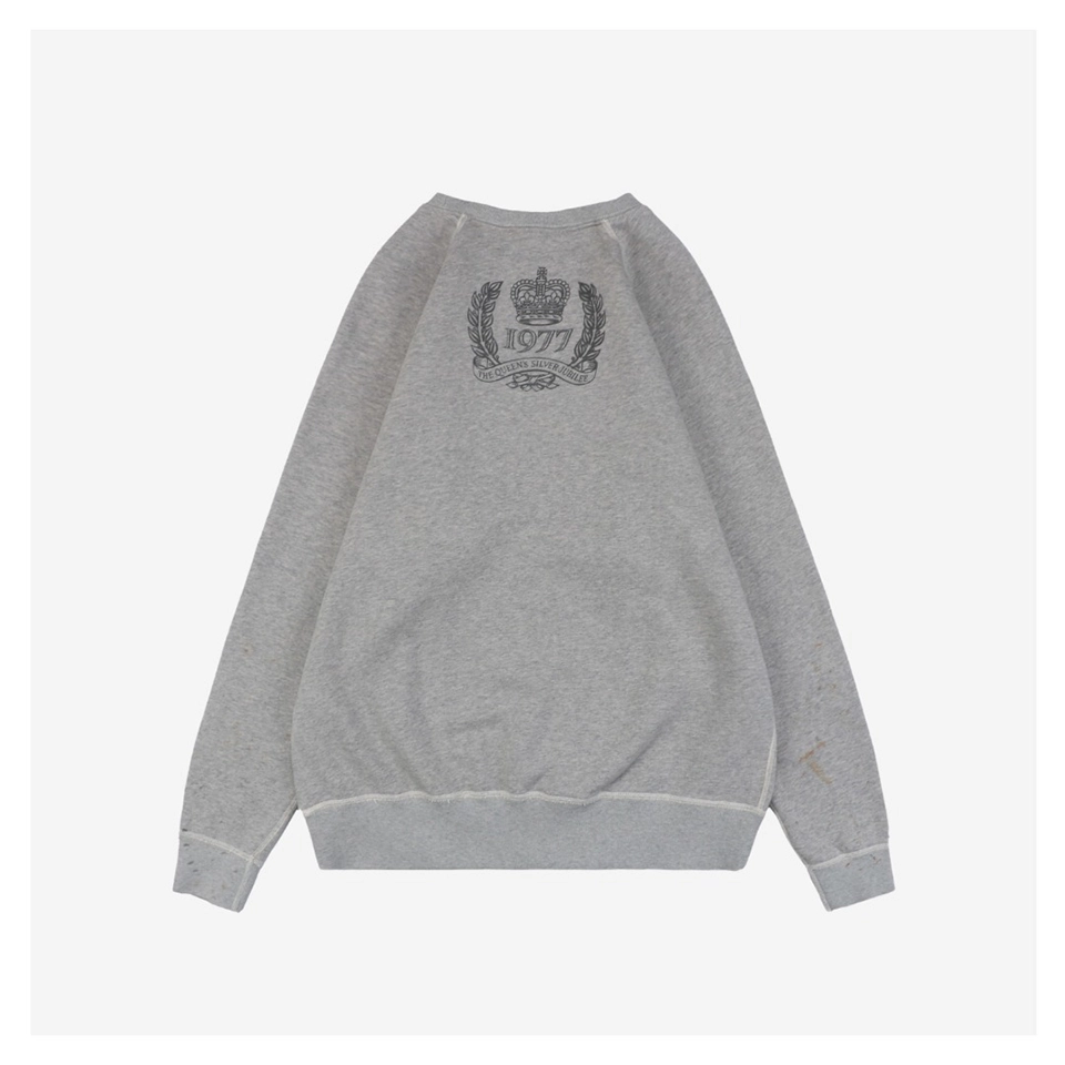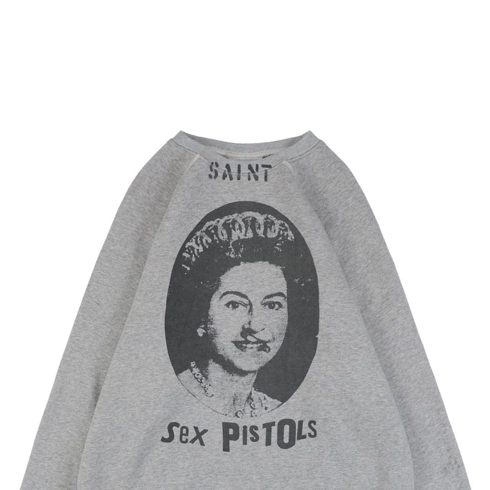 The Saint Michael Queen Elizabeth Sex Pistols Distressed Shirt fuses British punk legacy with vintage Americana styling. Featuring a bold stencil-style portrait of Queen Elizabeth defaced in classic Sex Pistols fashion, this grey crewneck is intentionally aged with rust-tone distress marks and a cracked ink finish. The back carries a crest marked “1977”, a nod to punk’s cultural uprising. Crafted with Saint Michael’s signature washed cotton for a worn-in, rebellious look.