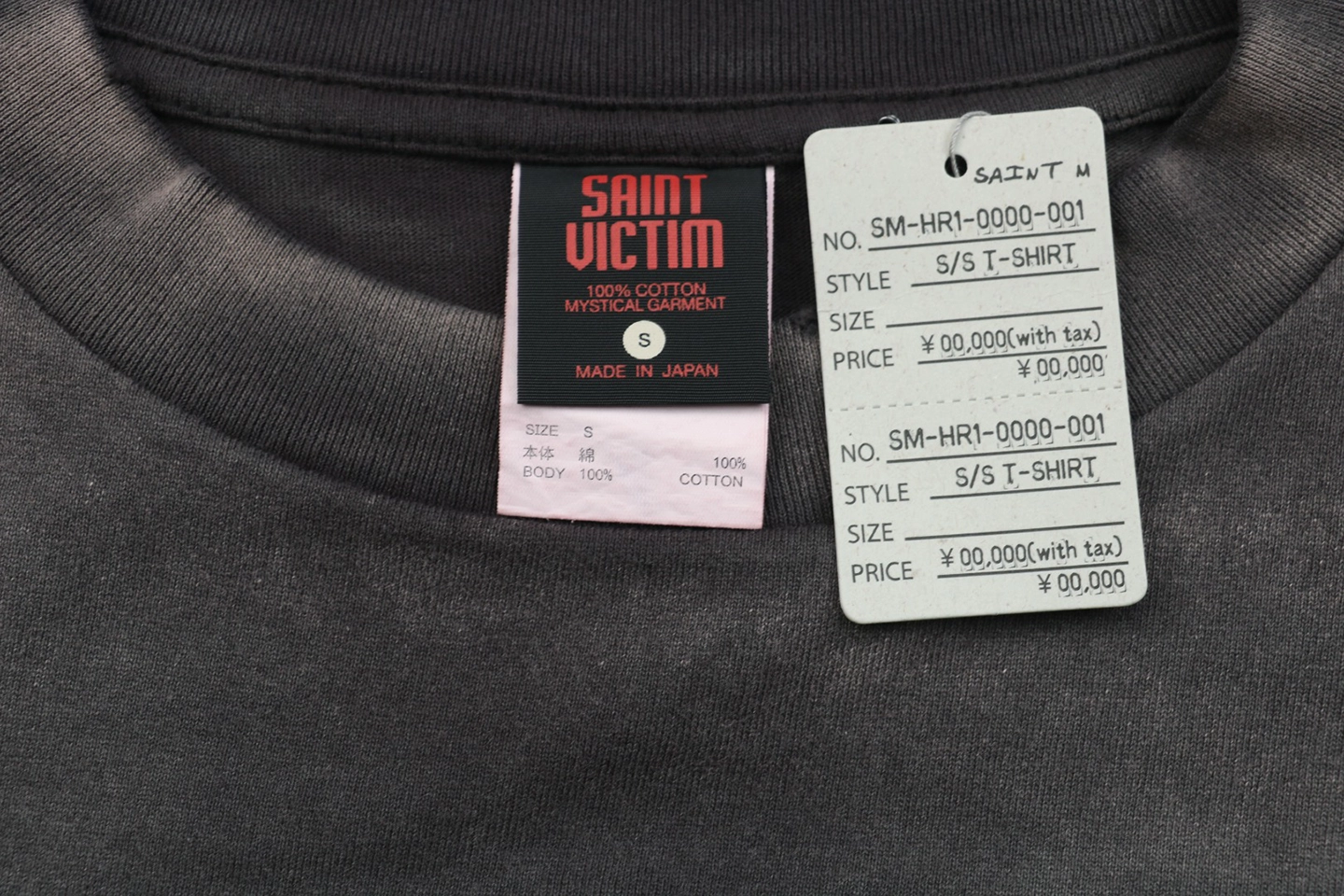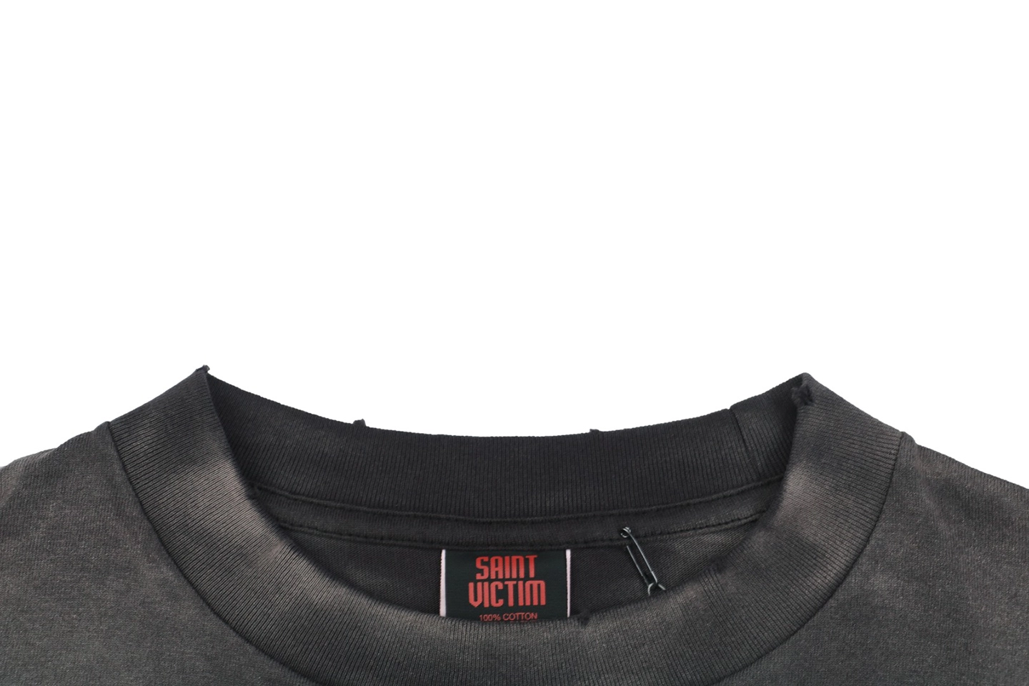 The tee features Saint Michael’s renowned Asut Dyeing + KMnO₄ spray fade process, creating a natural vintage gradation effect with subtle lightened patches throughout the black fabric. Each piece obtains its unique aged texture through hand-distressing techniques such as neck and cuff abrasion, adding authenticity to the vintage aesthetic.