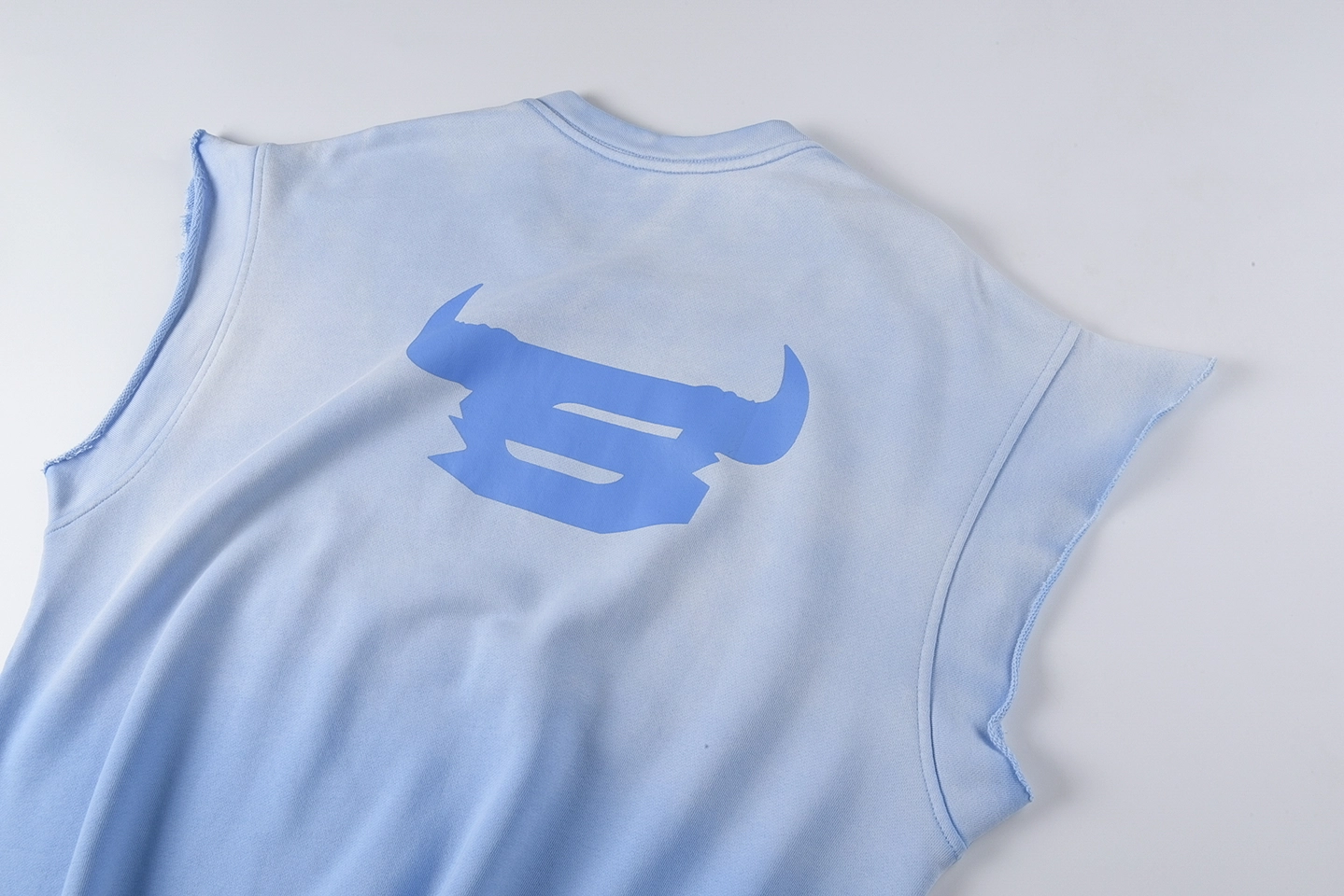 The Sp5der 1986 State Finalist Sleeveless Tee delivers a vintage athletic aesthetic with a modern streetwear twist. Designed in a soft sky blue gradient wash, this cut-off silhouette features raw sleeve edges and a slightly distressed neckline for a worn-in, retro feel. The front showcases layered collegiate-inspired graphics including “SP5DER Recreation Departments”, “1986 State Finalist”, and badge-style emblems, giving it a nostalgic sports department vibe. On the back, a bold horned emblem graphic sits across the upper panel, while a subtle “55” print near the hem adds a jersey-inspired finishing touch. The relaxed sleeveless cut enhances mobility and statement styling.