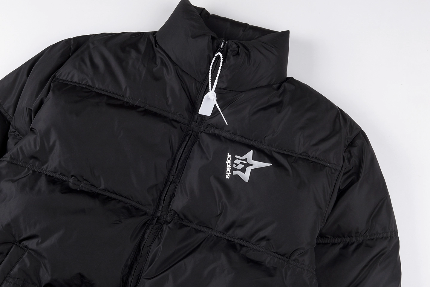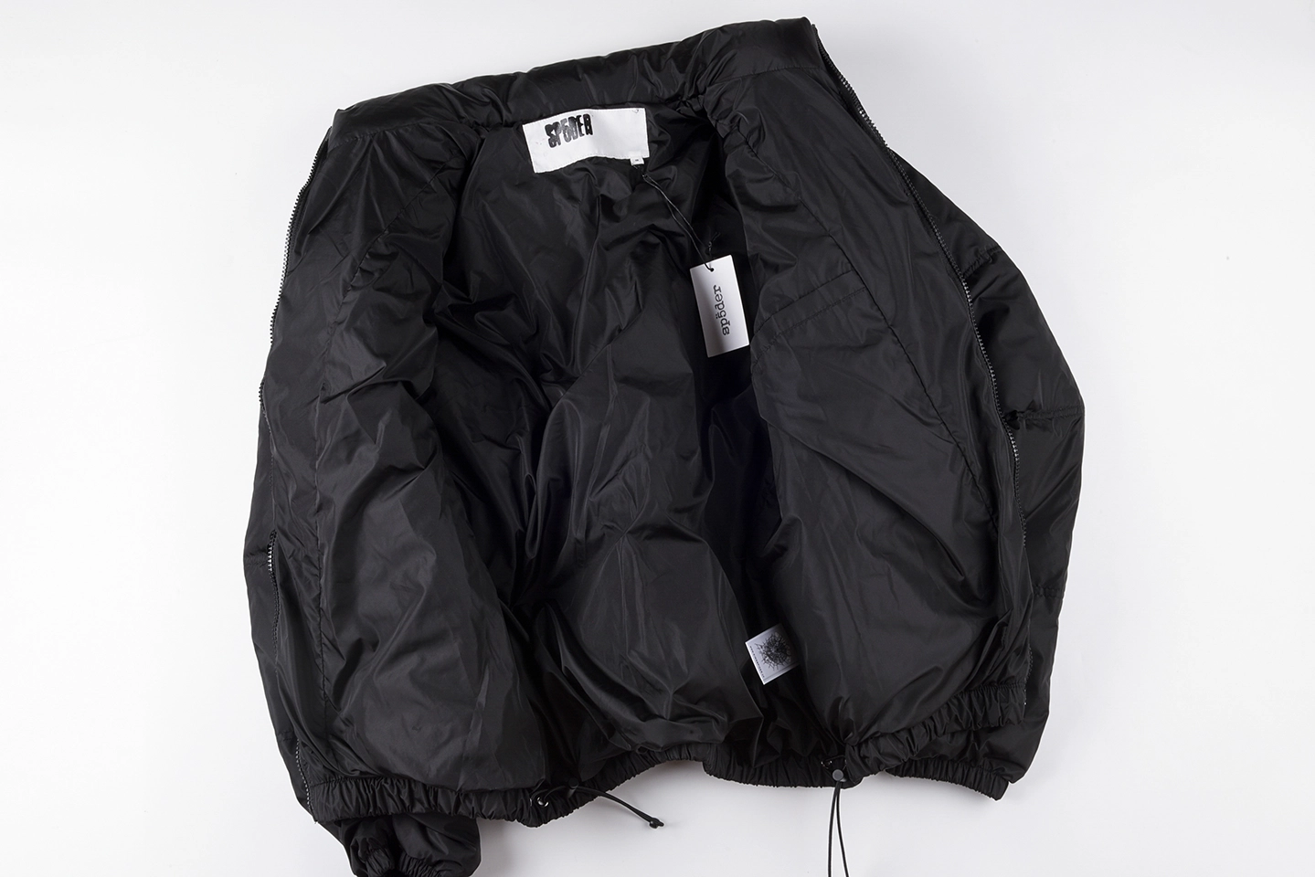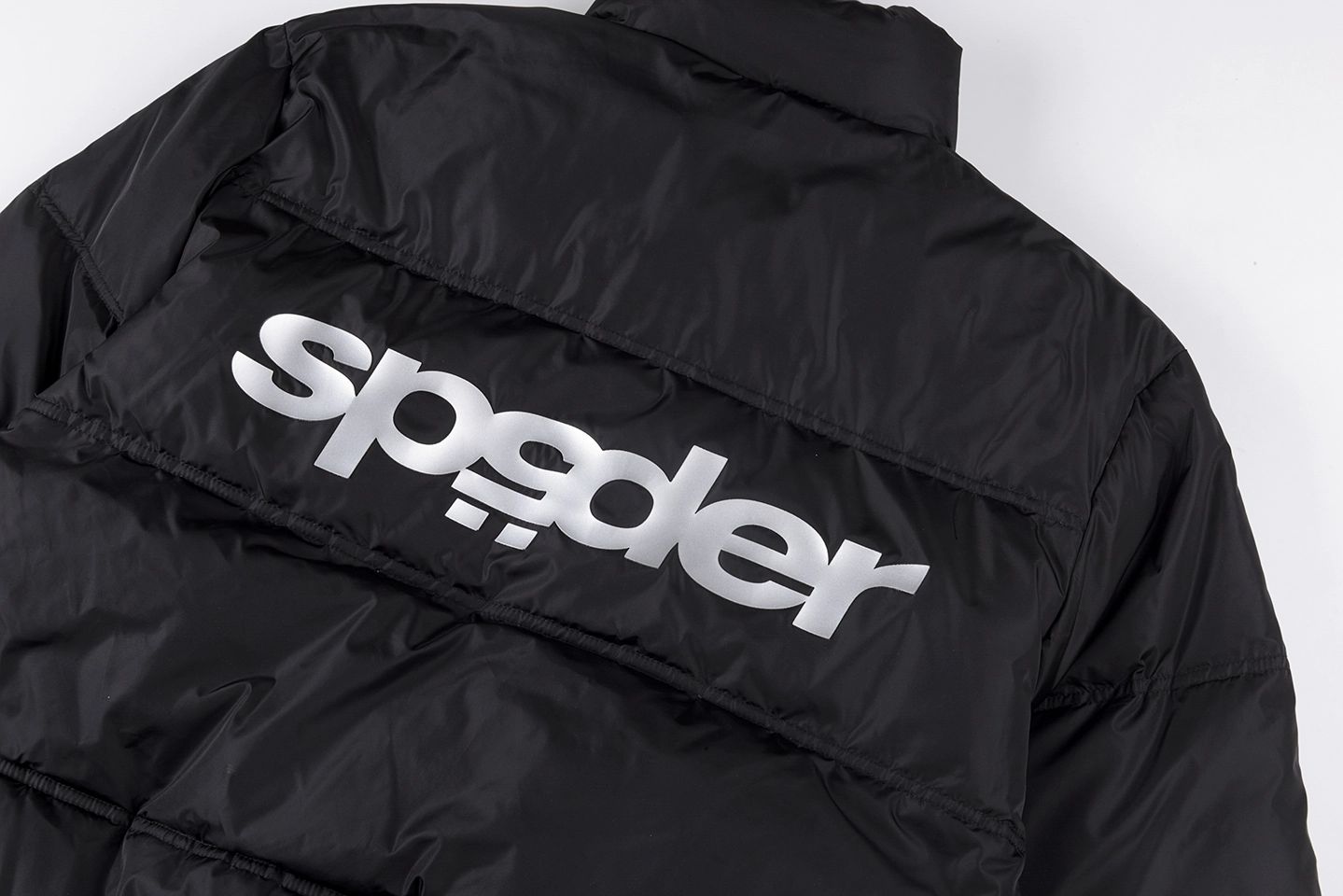 A subtle star logo detail on the chest adds a refined touch, while the back is highlighted by a large Sp5der logo print, creating strong visual contrast against the all-black base. The elasticated hem and cuffs help lock in warmth while enhancing the jacket’s structured shape.