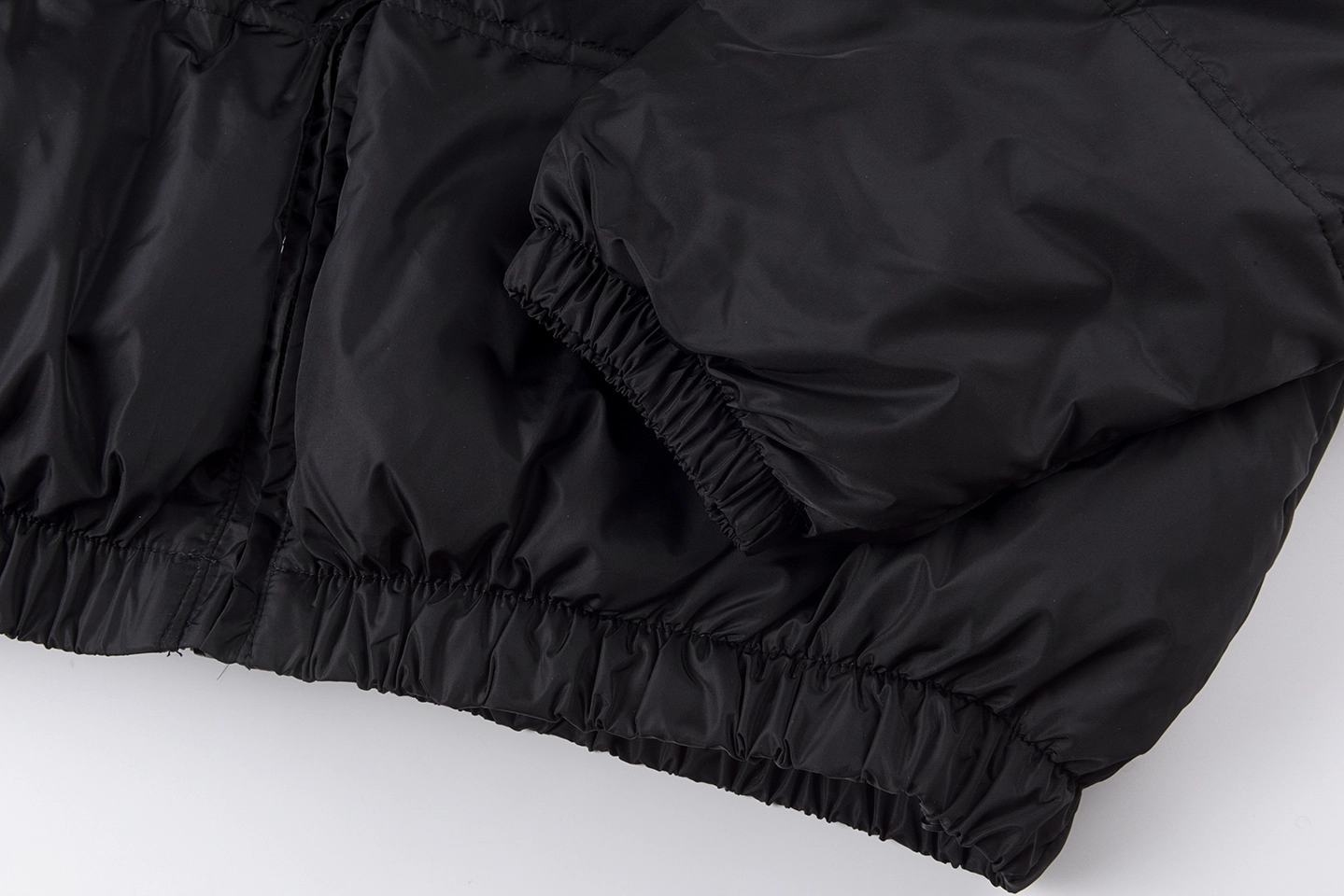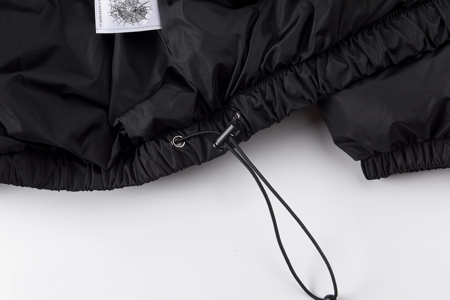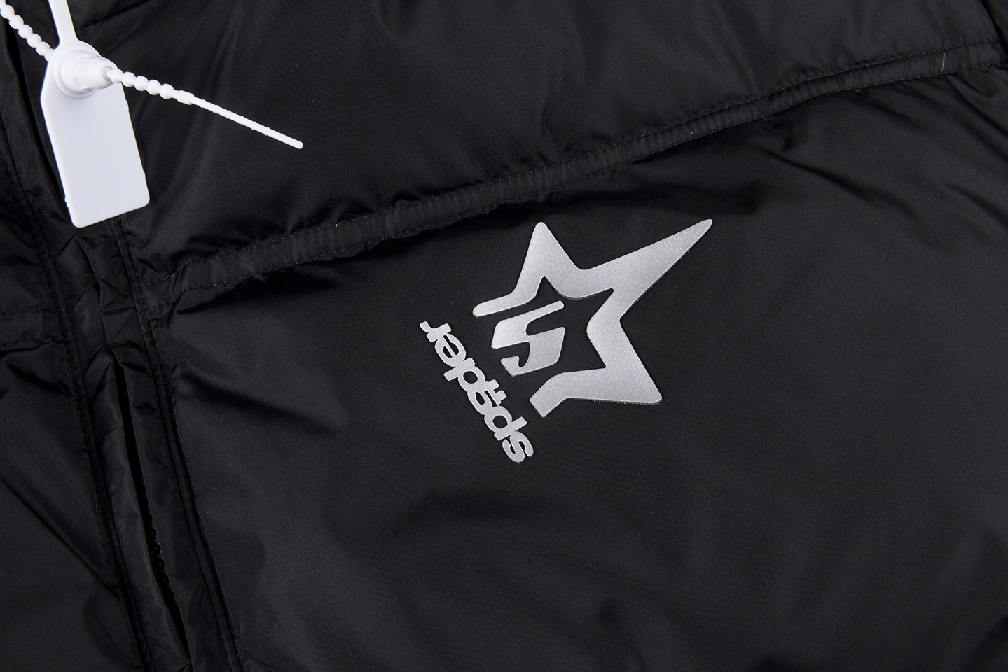 A subtle star logo detail on the chest adds a refined touch, while the back is highlighted by a large Sp5der logo print, creating strong visual contrast against the all-black base. The elasticated hem and cuffs help lock in warmth while enhancing the jacket’s structured shape.