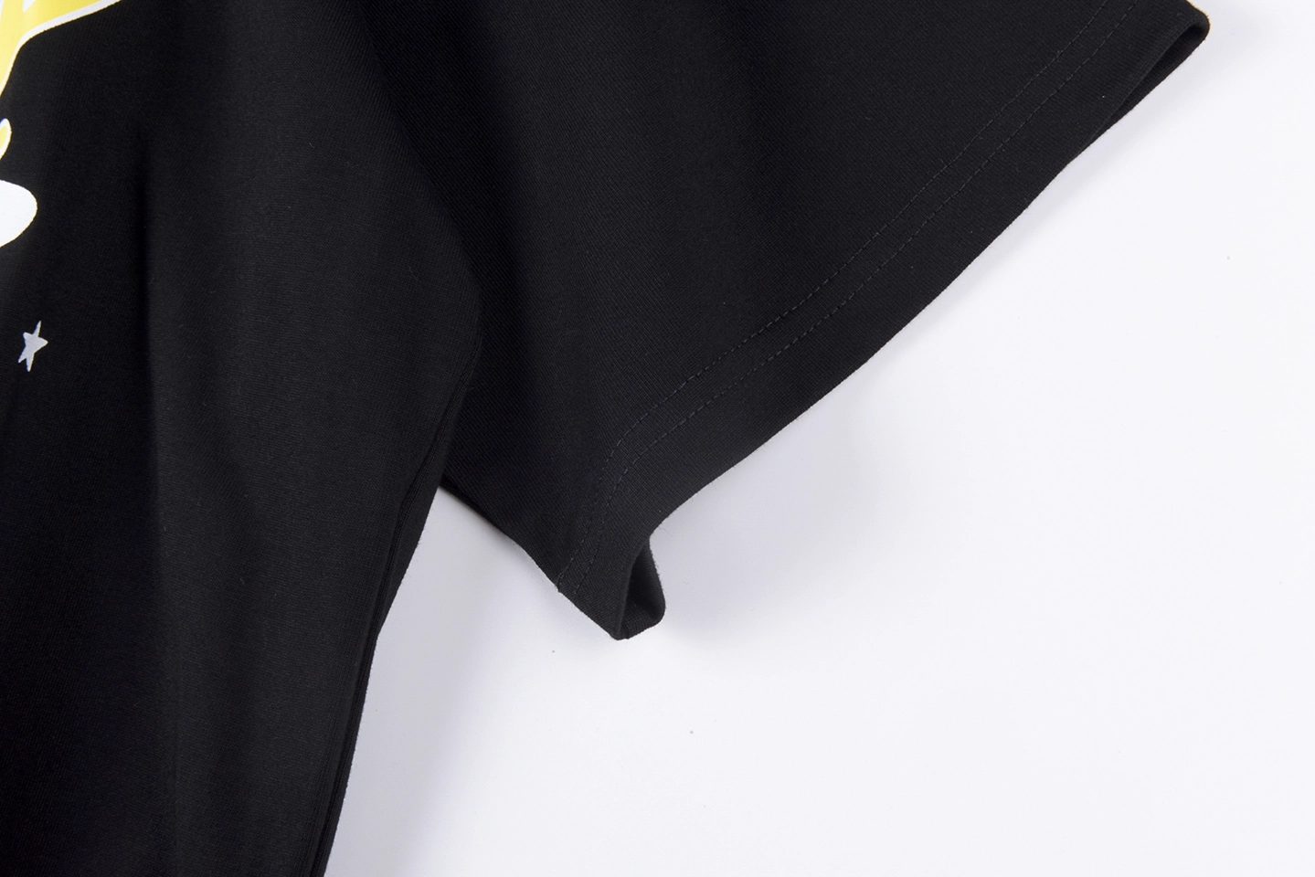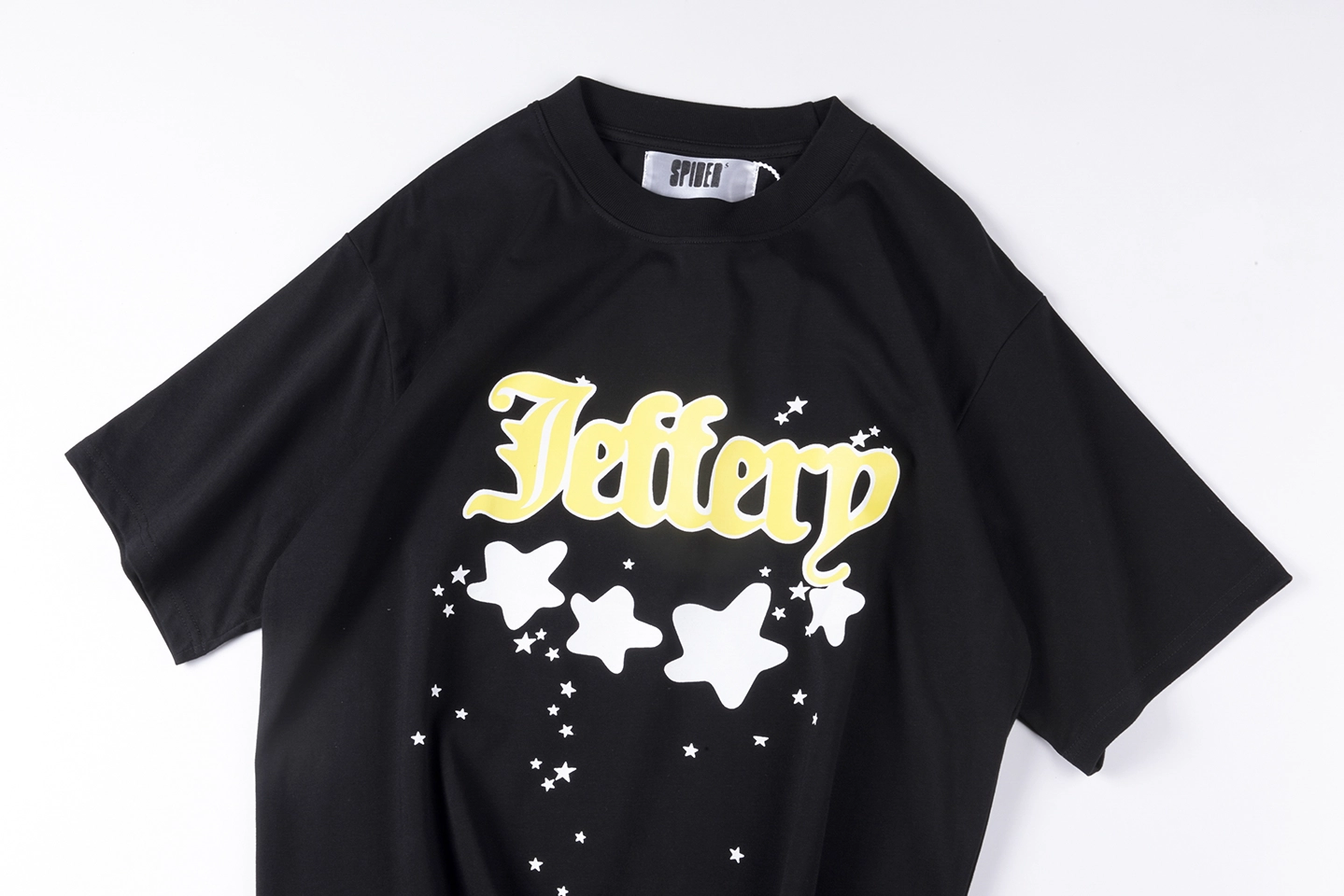 The Sp5der Black & Yellow “Jeffery” Star Graphic T-Shirt blends bold color contrast with playful street graphics. Crafted on a deep black cotton base, the front features a standout yellow “Jeffery” script logo accented by oversized white star graphics and scattered mini stars for added movement and dimension. The clean black backdrop enhances the vibrant yellow lettering, making the design pop effortlessly.