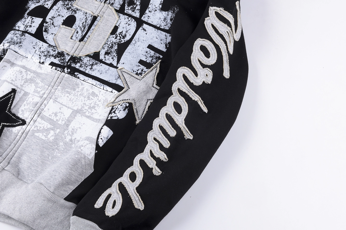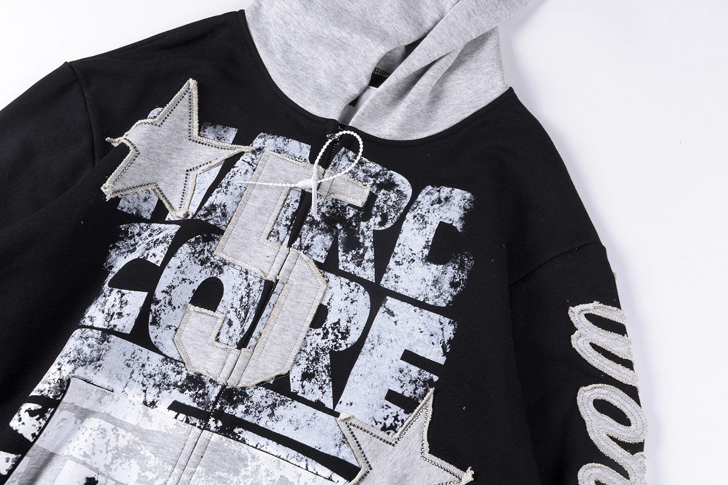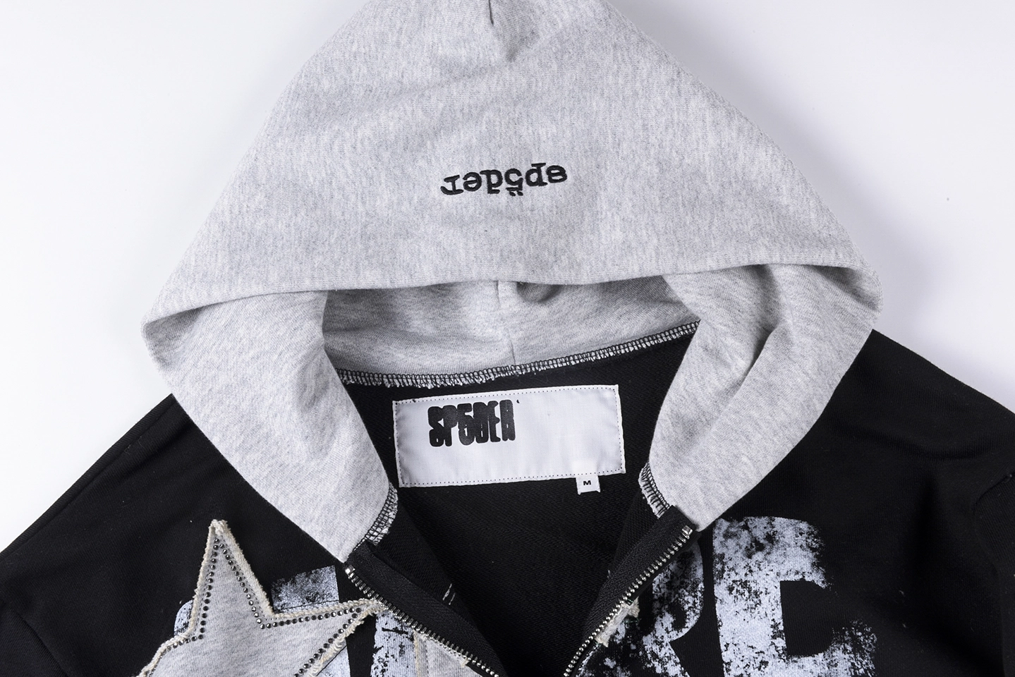 Designed with a black body and grey hood/cuffs contrast, this hoodie creates a layered visual effect that feels both modern and versatile. The front showcases a large “Future Core” graphic print, enhanced with star patch details that add texture and dimension. A script-style Sp5der logo runs along the sleeve, reinforcing the signature branding from multiple angles.