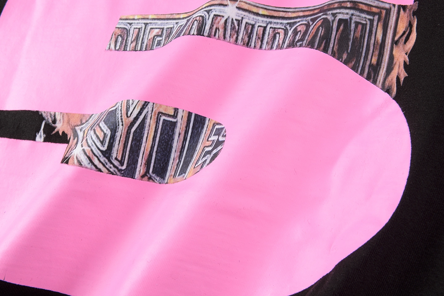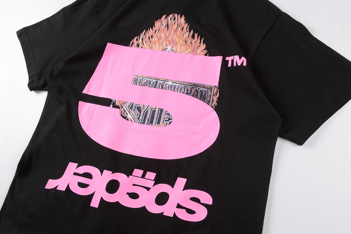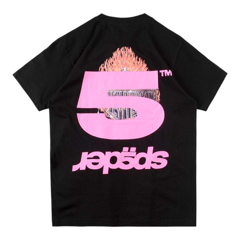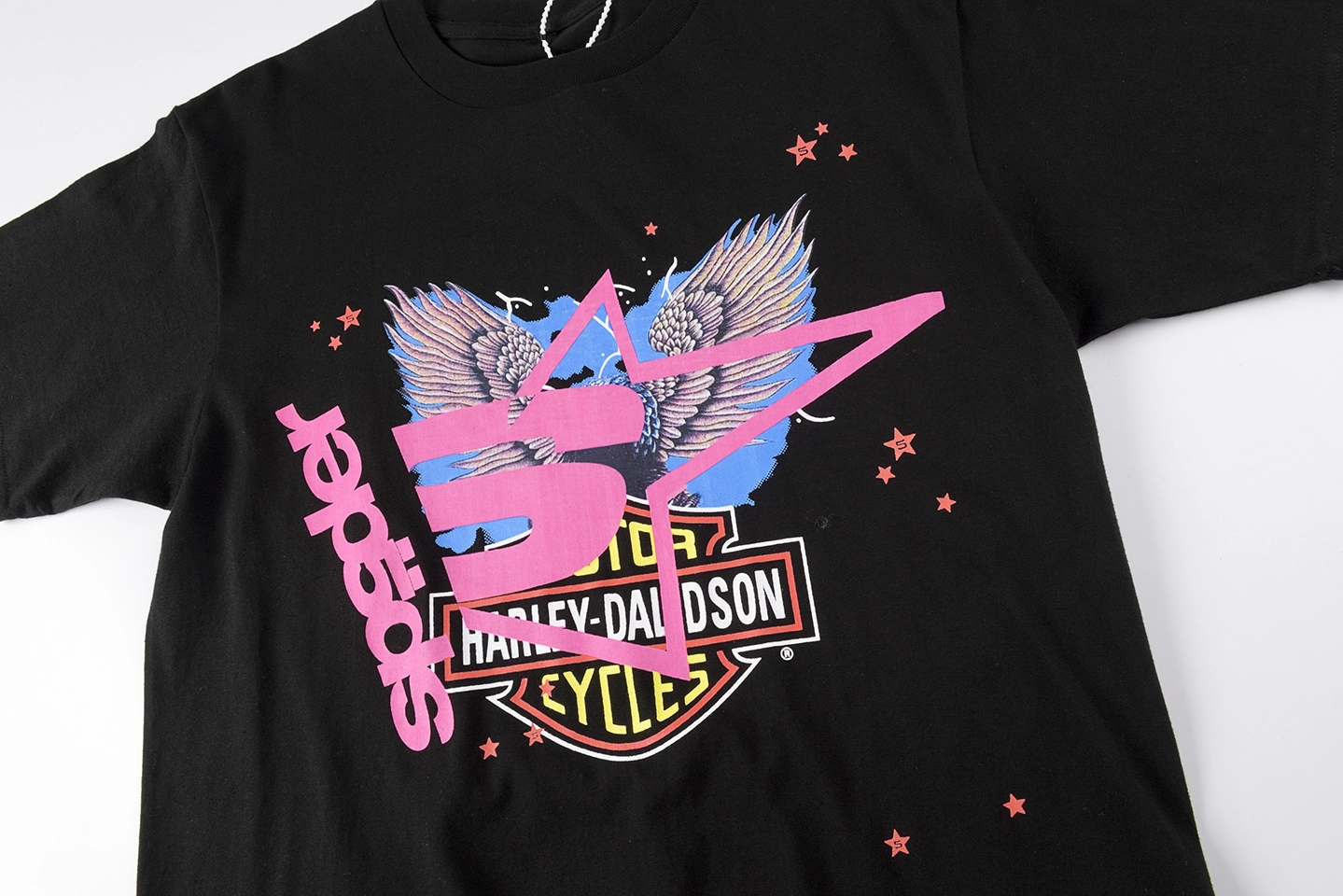 The Sp5der Harley Flame Star Graphic T-Shirt merges classic biker iconography with bold Sp5der street energy for a high-impact, remix-style design. Set on a clean jet black cotton base, the front features a layered Harley-Davidson inspired emblem with wing and flame elements, aggressively overlaid by the signature Sp5der star logo in vivid pink. Scattered star accents amplify the chaotic visual rhythm, while the back is dominated by an oversized pink “5 spëder” logo print, ensuring instant recognition from every angle. This tee delivers a perfect balance of retro rebellion, graphic intensity, and modern streetwear attitude.