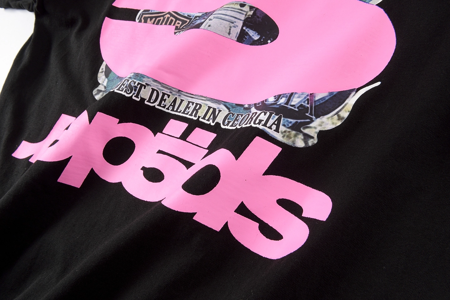 The Sp5der Harley Georgia Star Graphic T-Shirt blends bold Sp5der streetwear attitude with raw American biker heritage for a striking, remix-driven design. Set on a clean jet black cotton base, the front features a layered Harley-Davidson inspired skull and motorcycle graphic, aggressively overlaid with the iconic pink Sp5der star logo for instant contrast. Scattered red star accents enhance the visual chaos, while the back is dominated by an oversized pink “5 spëder” logo print, layered over Georgia dealership-inspired graphics, reinforcing a rebellious, location-rooted narrative.