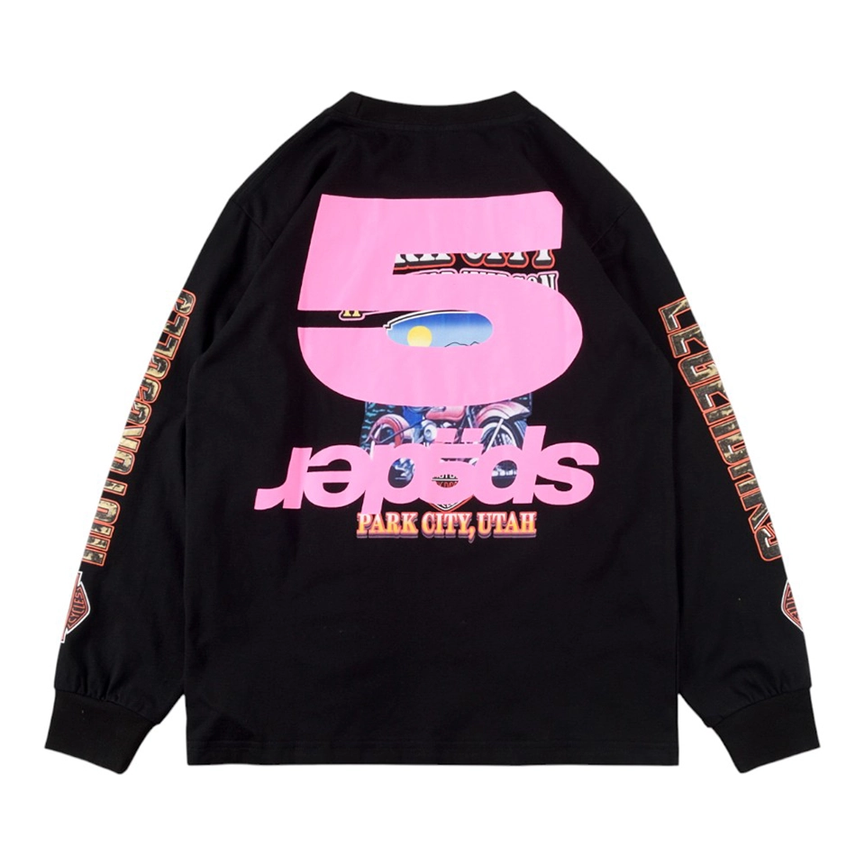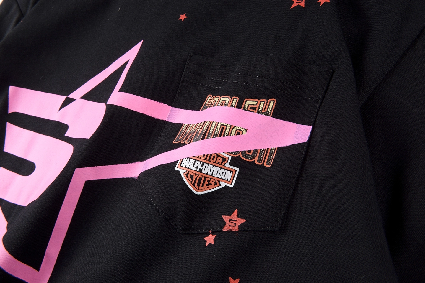 The Sp5der Harley Park City Graphic Shirt fuses bold Sp5der streetwear identity with rugged American biker culture for a statement-driven design. Set on a clean jet black cotton base, the front features a striking pink Sp5der star logo layered with scattered red star accents, delivering sharp contrast and visual energy. The sleeves are fully wrapped with Harley-Davidson inspired typography and badge graphics, amplifying the biker influence. On the back, an oversized pink “5 spëder” logo dominates the design, layered over a Park City, Utah motorcycle graphic, creating a powerful, location-driven narrative.