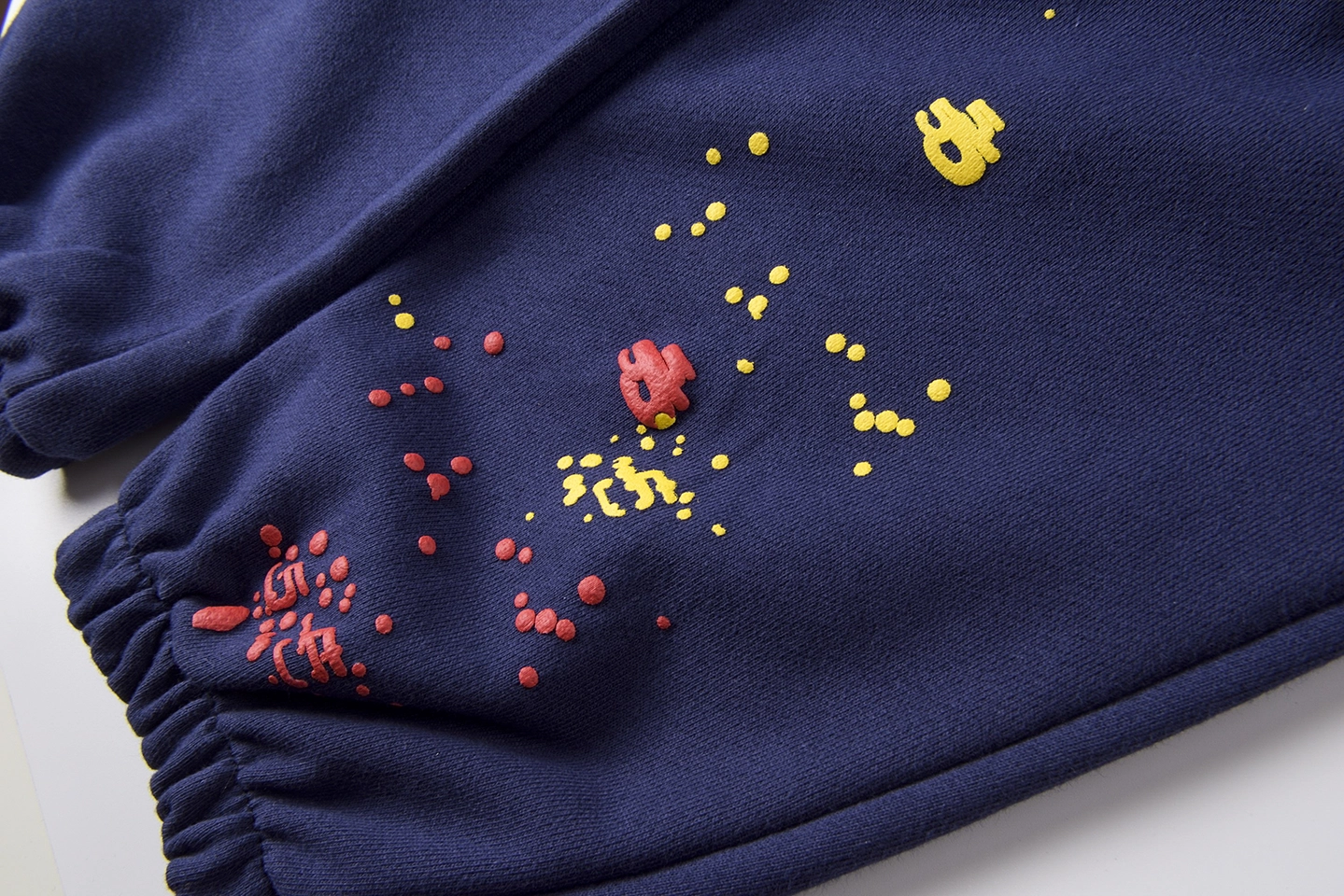 The Sp5der Insect Groupe Splatter Graphic Sweatpants continue the brand’s dark underground streetwear language with a focus on raw texture and distressed visuals. Designed on a deep navy blue cotton base, these sweatpants feature bold paint-splatter graphics in red and yellow scattered across the legs, paired with a subtle spider web motif for signature Sp5der symbolism. With a relaxed tapered silhouette, elastic waistband, and cuffed hems, this piece delivers both attitude and everyday comfort.