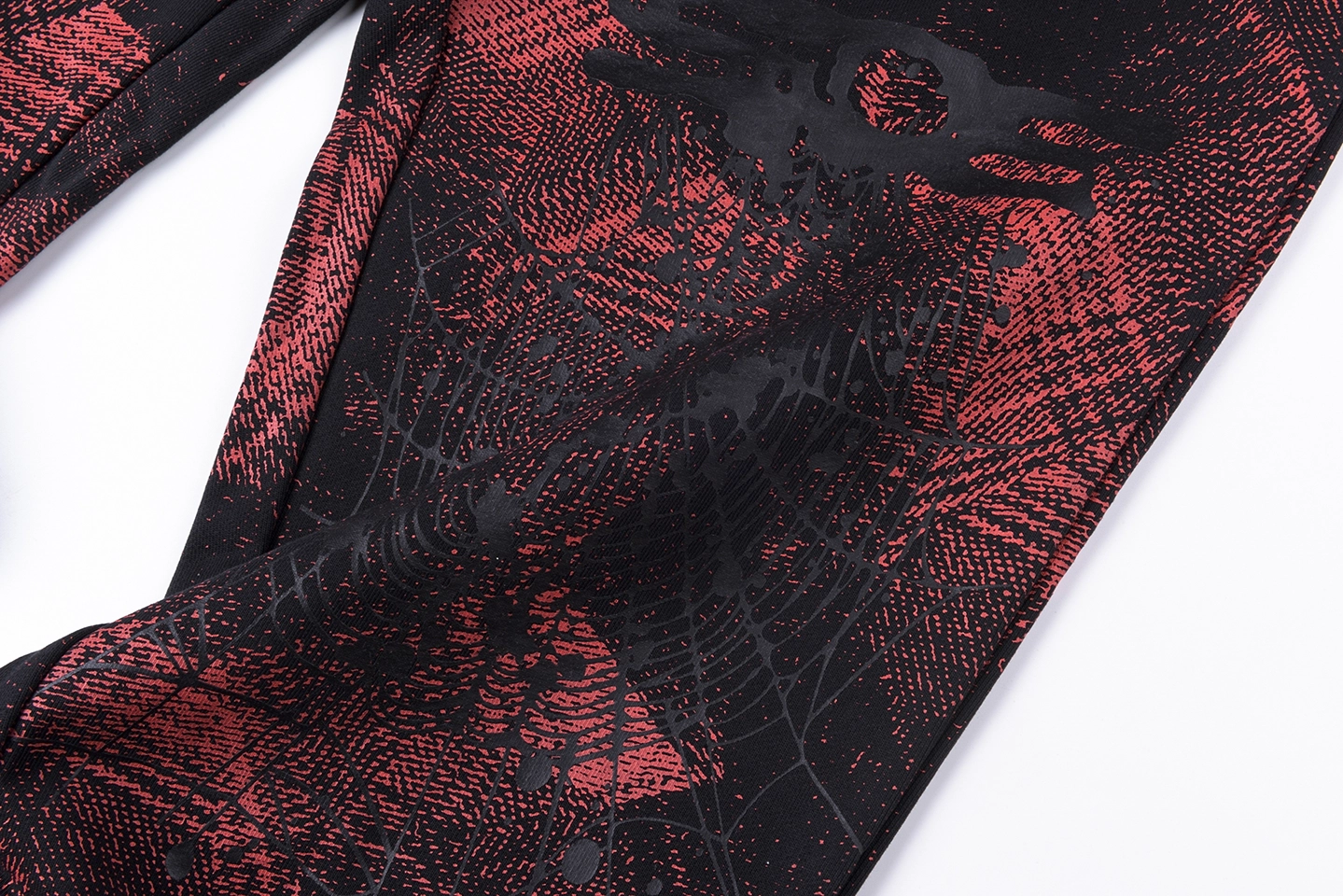 The Sp5der Red Black All-Over Print Sweatpants bring a bold, graphic-heavy aesthetic with a standout color palette, perfect for statement streetwear fits.
