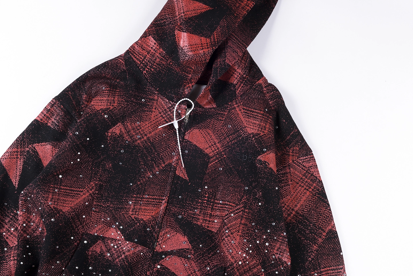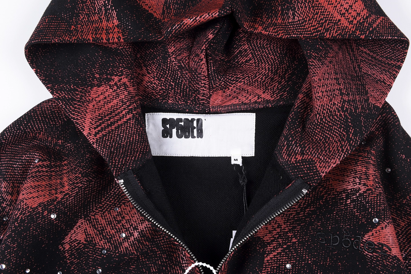 The Sp5der Red Black All-Over Print Zip Hoodie pushes bold streetwear energy with a full-coverage graphic design and standout visual texture.