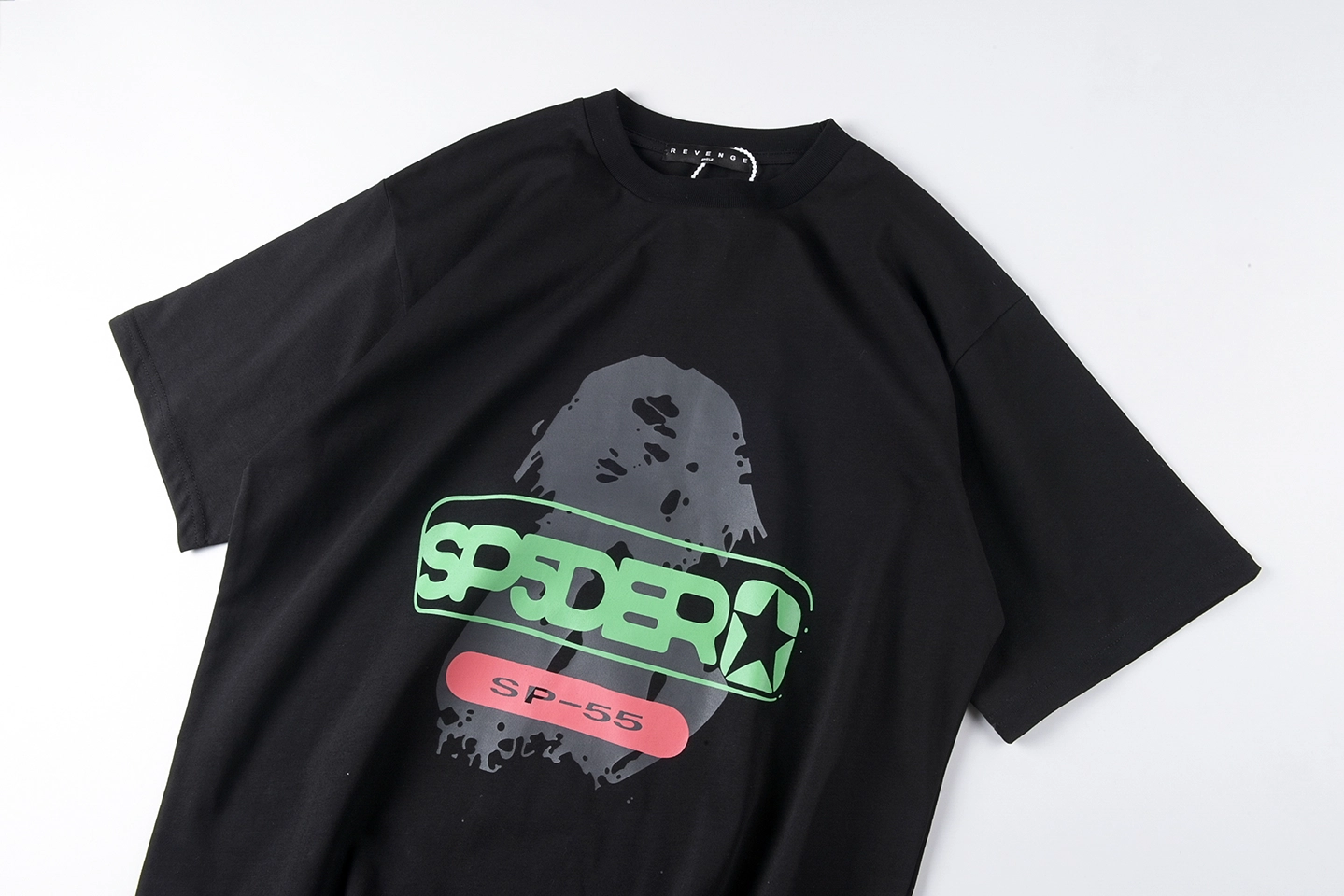 The Sp5der Reunion 555 Graphic T-Shirt merges bold color blocking with layered street graphics. Crafted from a classic jet black cotton base, the front features a vibrant SP5DER logo panel in neon green, layered over a shadow-style graphic backdrop for added depth. Beneath it, a contrasting “SP-55” pink badge detail reinforces the collection identity. The back commands attention with oversized multicolor “REUNION 555” typography, blending purple, green, red, and yellow tones for a playful yet statement-driven finish. The relaxed fit and structured cotton construction make it a versatile everyday essential with standout appeal.