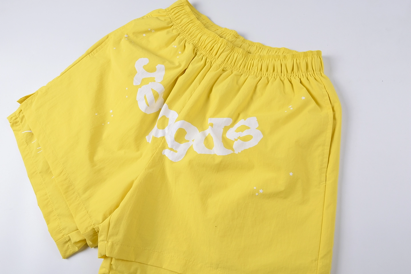 The Sp5der Sunburst Yellow Logo Graphic Shorts deliver vibrant summer energy with bold street identity. Crafted from lightweight sunburst yellow fabric, the front features an oversized white Sp5der logo arched across the body for a strong, high-contrast statement. Subtle mini star accents add depth and texture, enhancing the dynamic look against the bright yellow base. Designed with a comfortable elastic waistband and relaxed athletic cut, these shorts blend standout color with everyday wearability.