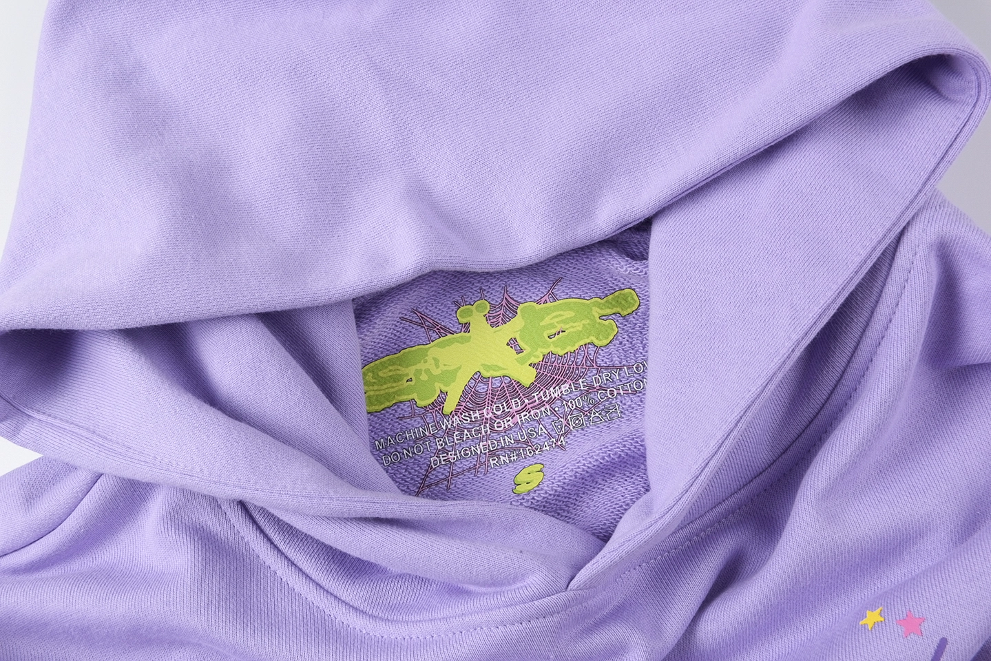 The Sp5der Web Star Graphic Hoodie combines soft pastel tones with bold layered detailing. Crafted from premium lavender cotton fleece, this hoodie features a large tonal spider web graphic across the chest, overlaid with a textured black “sp5der” logo accented by subtle rhinestone-style embellishments. Multicolor mini star graphics are scattered throughout the front, sleeves, and back, adding playful contrast against the muted base. The back keeps it minimal with scattered star detailing for a balanced 360° aesthetic. Finished with a kangaroo pocket and ribbed trims, it blends statement design with everyday comfort.