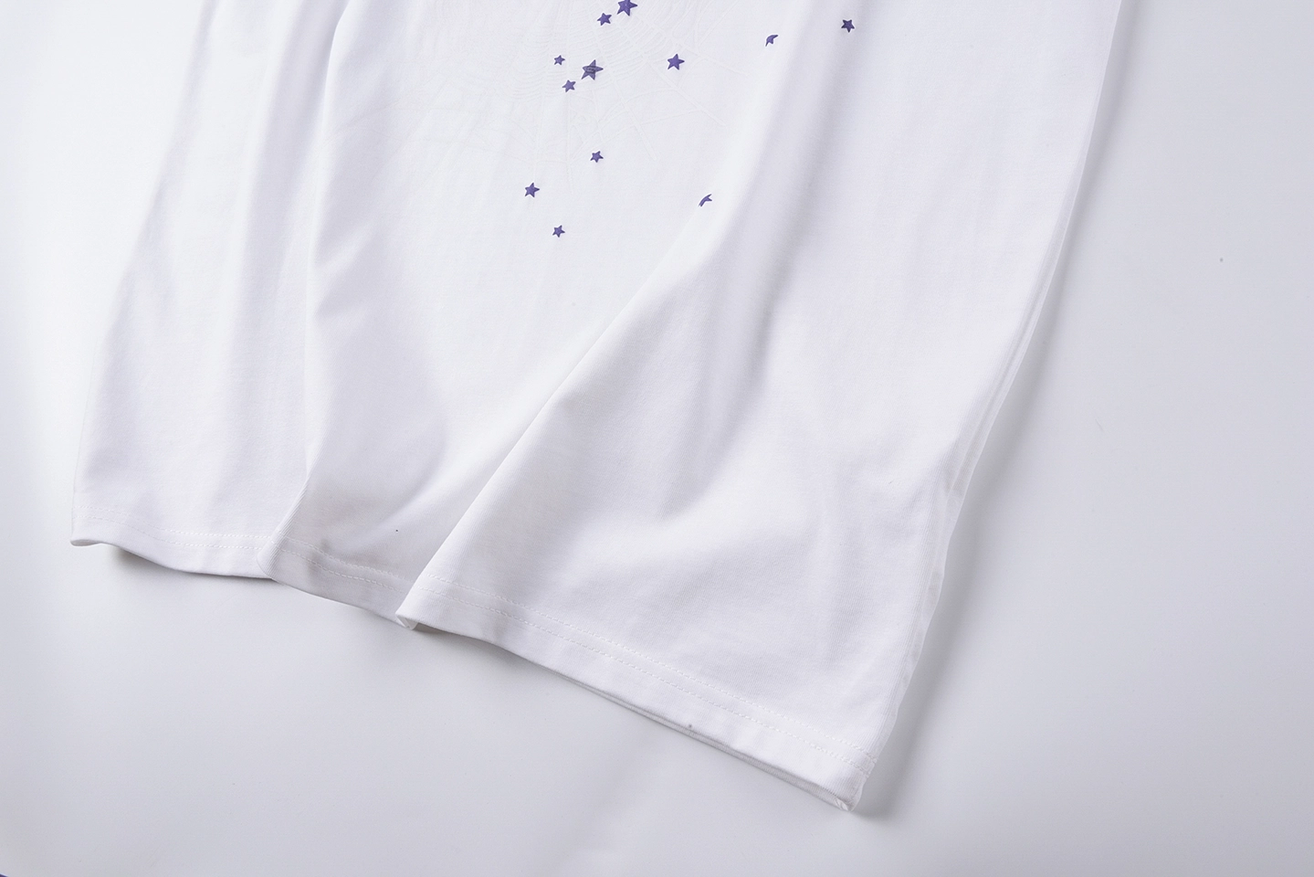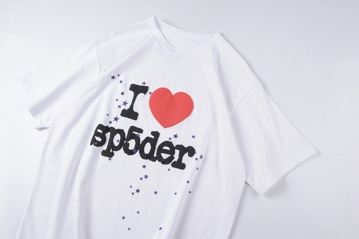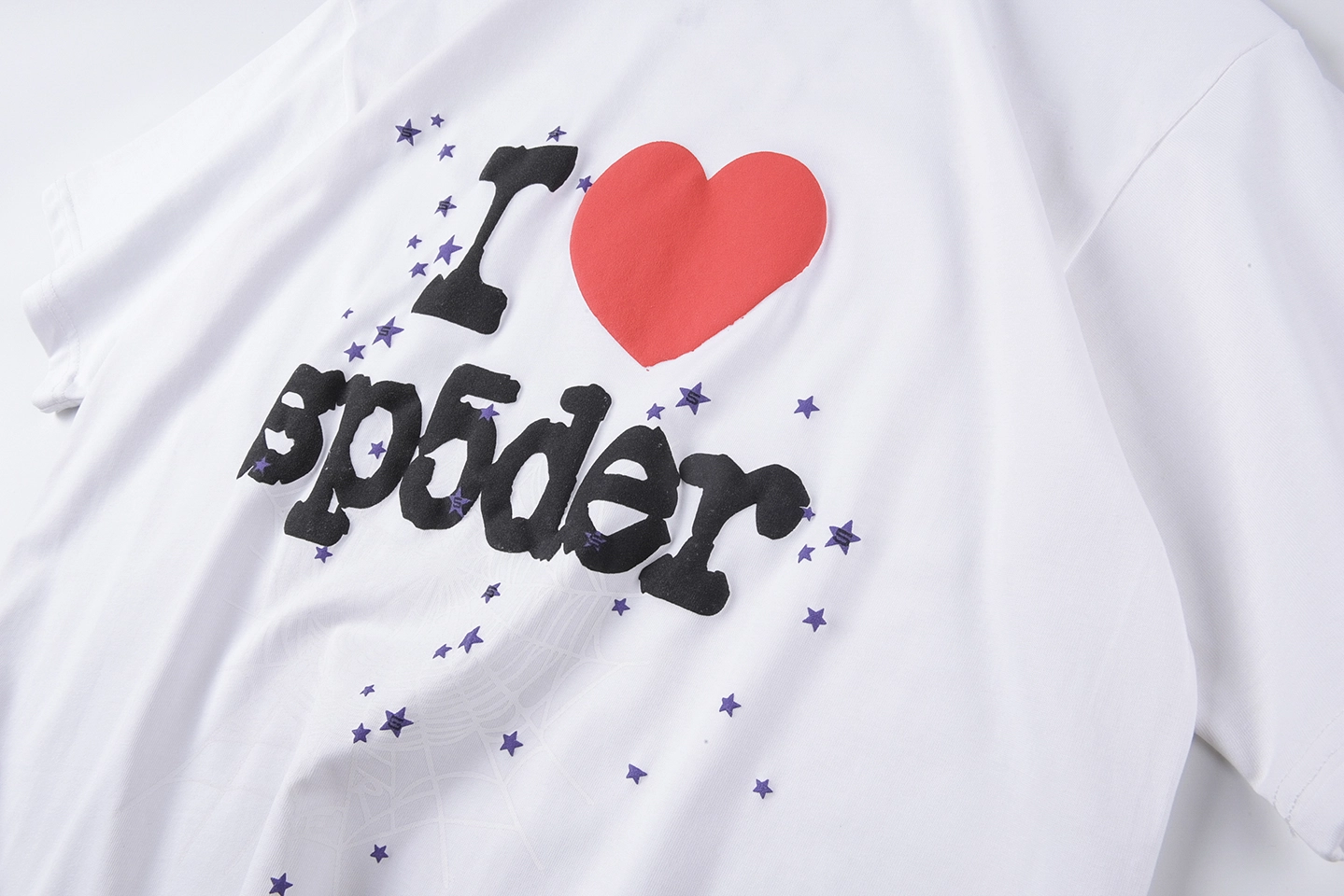 The Sp5der White I Heart Logo Star Graphic T-Shirt delivers playful energy with bold contrast detailing. Crafted from soft white cotton jersey, the front features a standout “I ♥ sp5der” graphic, combining a vivid red heart with textured black logo lettering. Scattered mini purple star accents surround the design, adding movement and a subtle cosmic vibe against the clean white base. The minimalist back keeps the focus on the expressive front artwork, while the relaxed short-sleeve silhouette ensures everyday comfort with street-ready appeal.