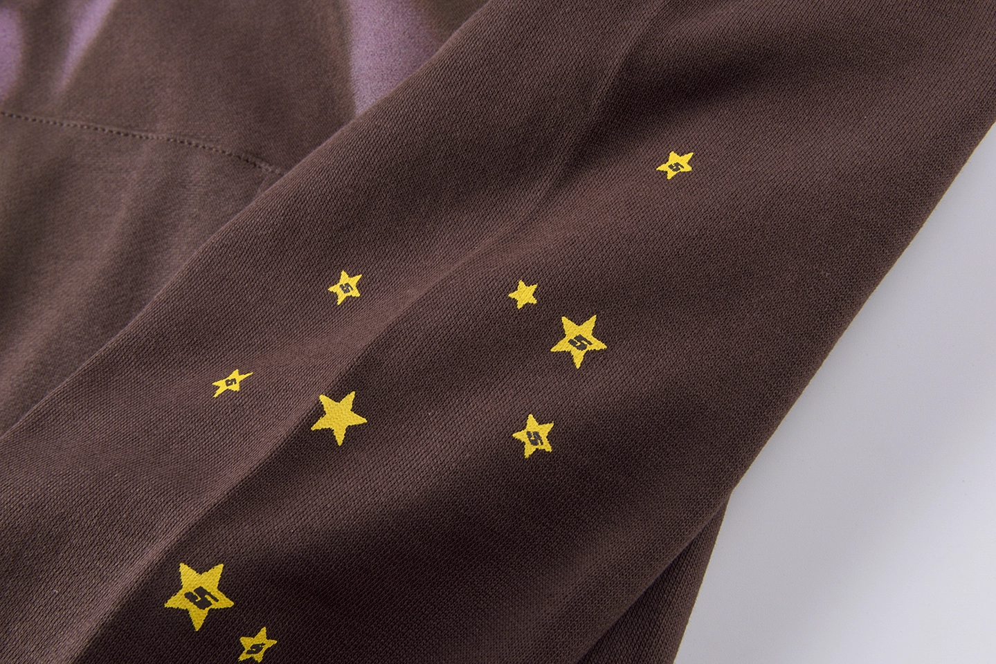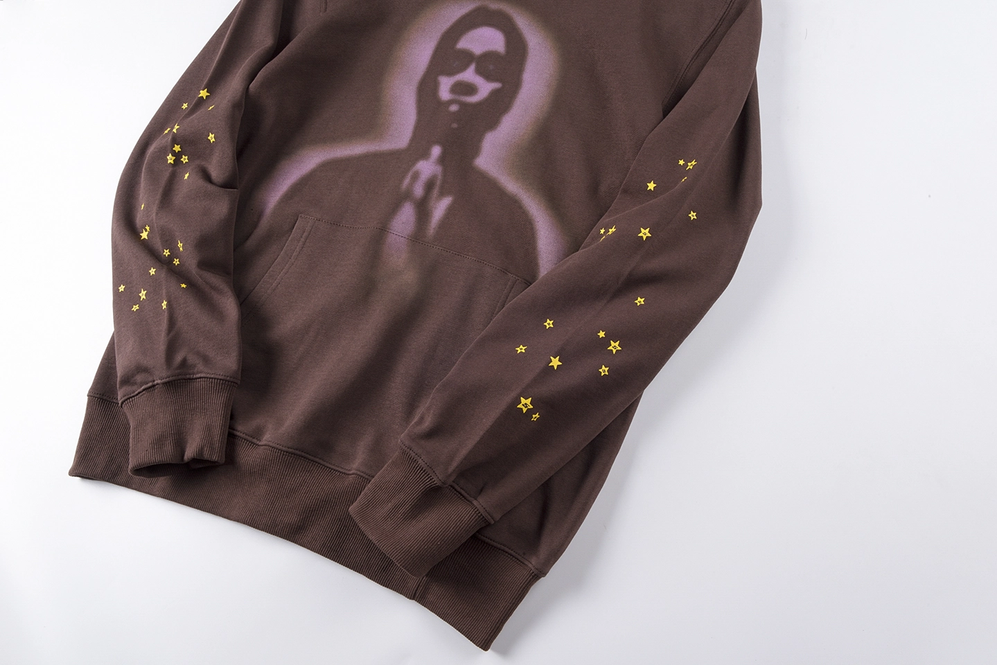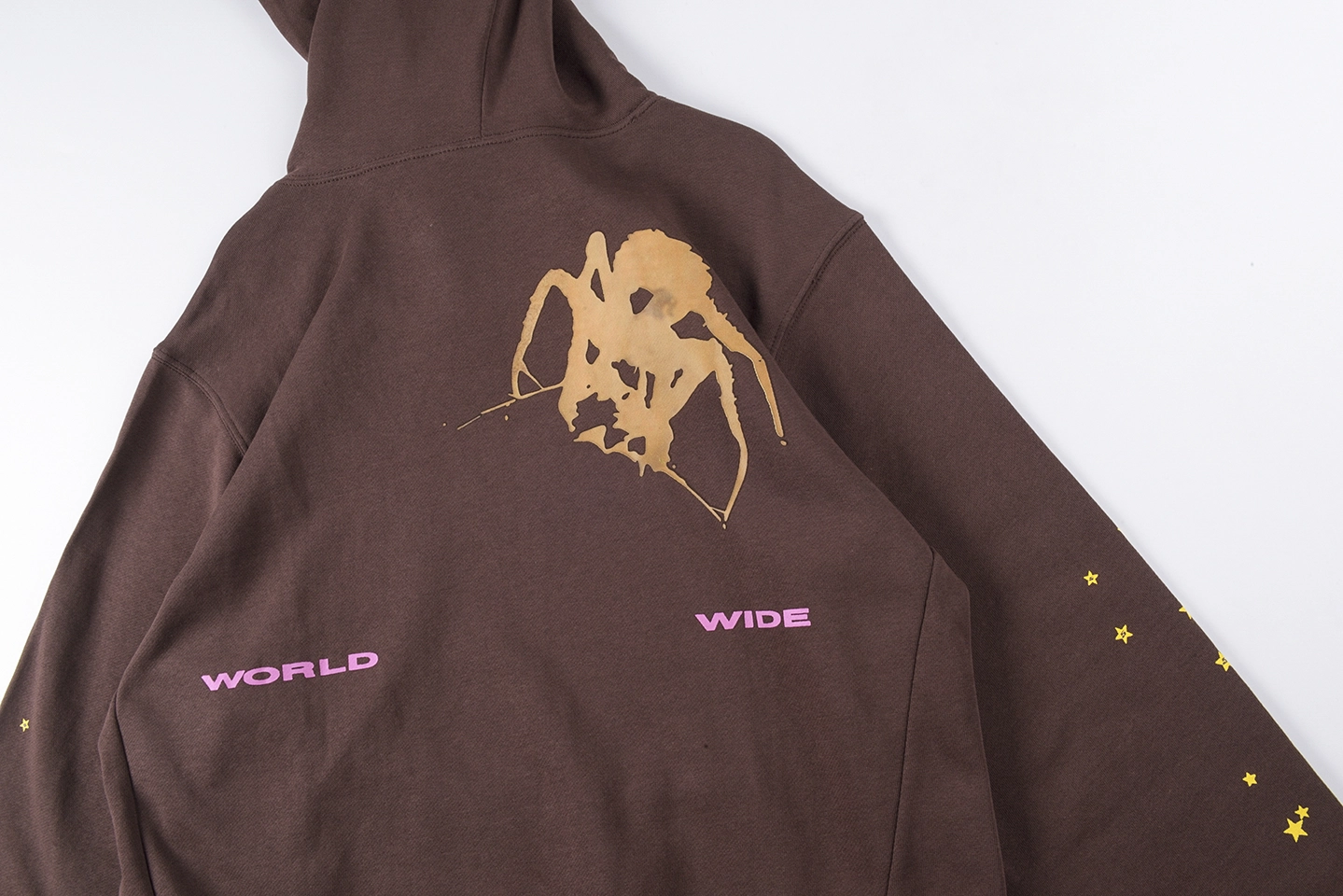 The Sp5der World Wide Shadow Graphic Hoodie blends moody street aesthetics with bold global identity branding. Crafted on a rich chocolate brown cotton fleece base, the front features a haunting airbrushed shadow figure graphic, softly faded to create a cinematic, atmospheric effect. Subtle yellow star accents scatter along both sleeves, adding movement and contrast. On the back, a striking gold spider emblem sits near the shoulder, paired with spaced “WORLD WIDE” typography in soft pink, reinforcing the brand’s worldwide presence. The fusion of minimal front energy and statement back detailing gives this hoodie a refined yet rebellious edge.