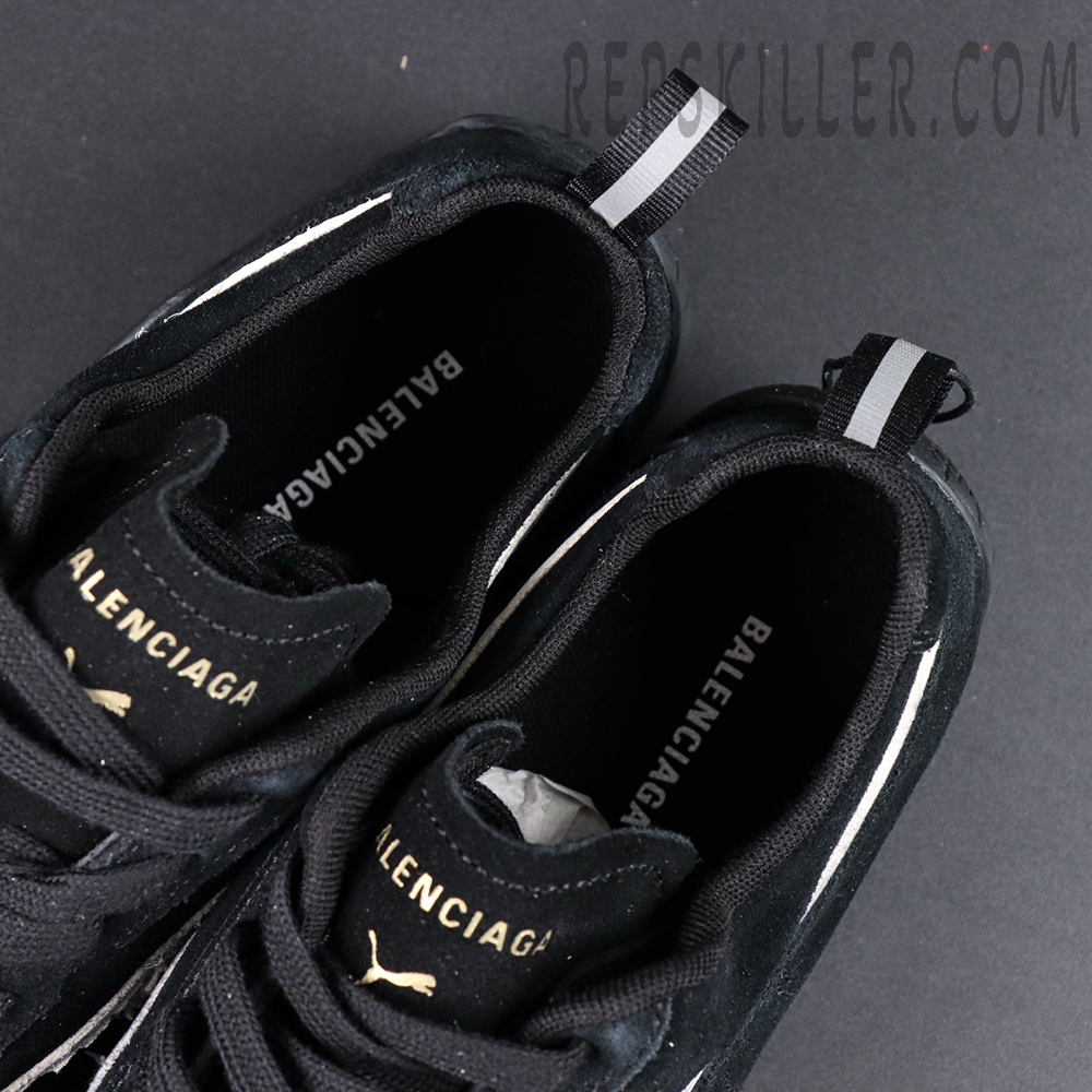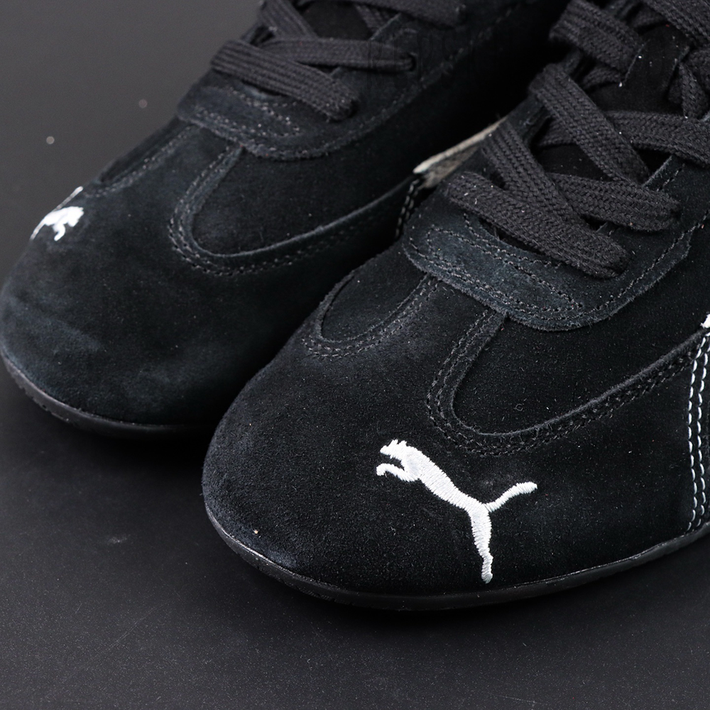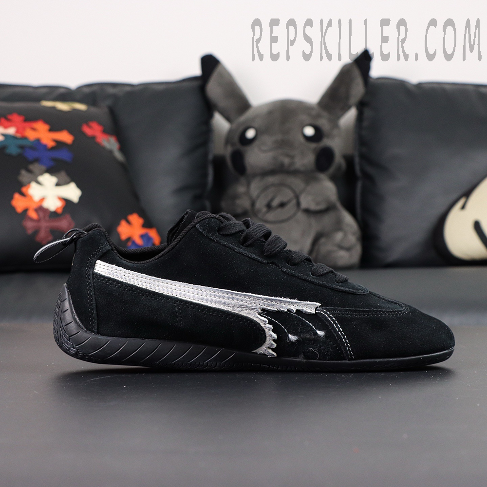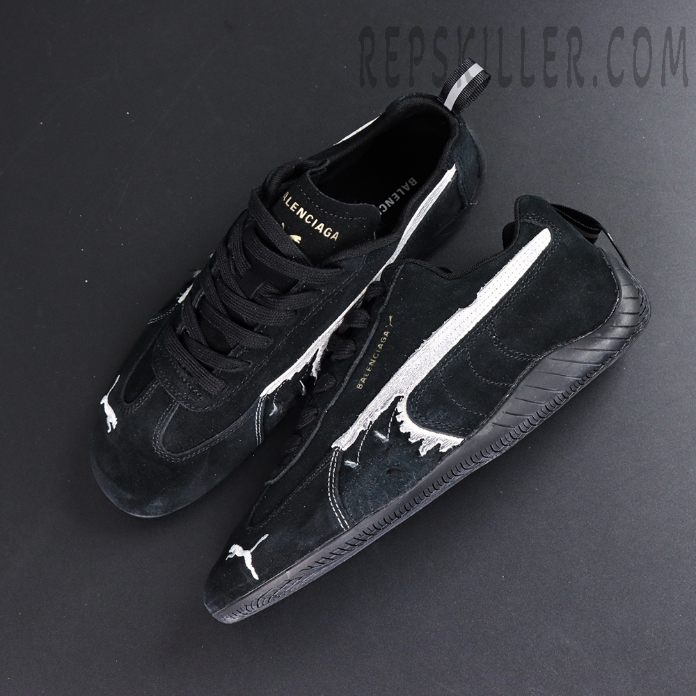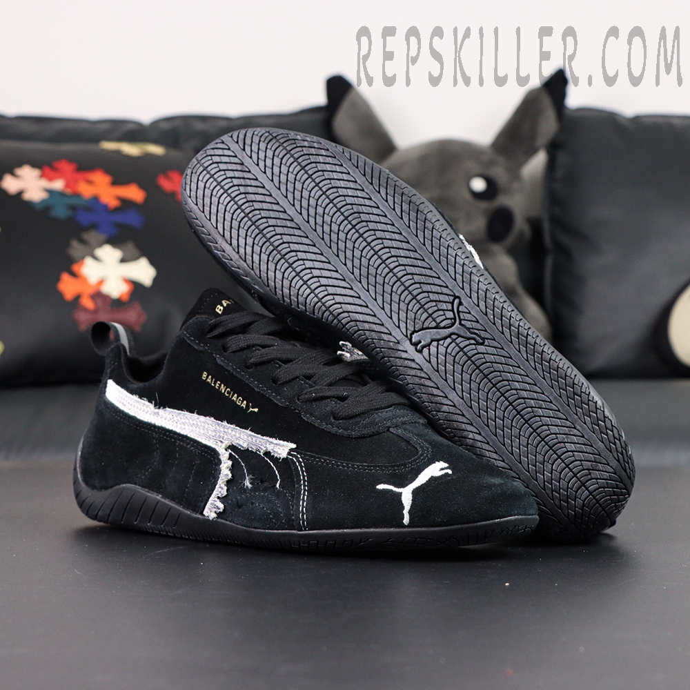 Speedcat Suede Balenciaga in Black/white reinterprets the iconic motorsport silhouette with a subversive luxury twist. Wrapped in black suede, the shoe features a distressed white PUMA formstrip and co-branded gold foil logo detailing, creating a stark contrast of textures and tone. The low-profile design emphasizes agility and retro driving style, while the asymmetric rubber outsole adds an elevated fashion edge. Perfect for avant-garde streetwear and nostalgic speedwear aesthetics.