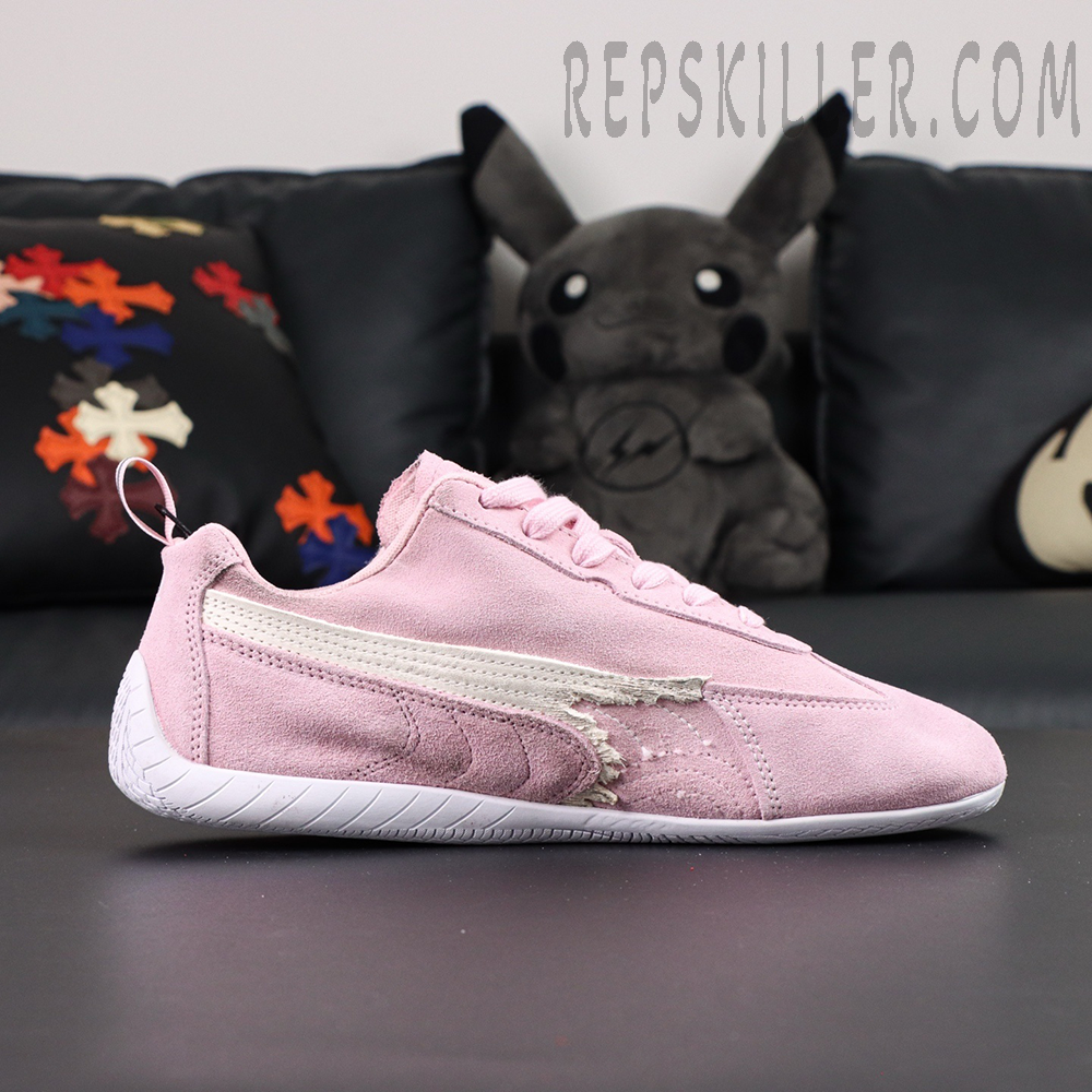 The Speedcat Suede Balenciaga in Pink/white channels vintage motorsport flair through a luxury lens. Wrapped in premium pink suede with raw, deconstructed detailing, the sneaker showcases collaborative design language between Balenciaga and Puma. A white embroidered feline logo and distressed stripe overlay highlight the subversive aesthetic, while the sleek, low-profile silhouette nods to classic racing footwear.