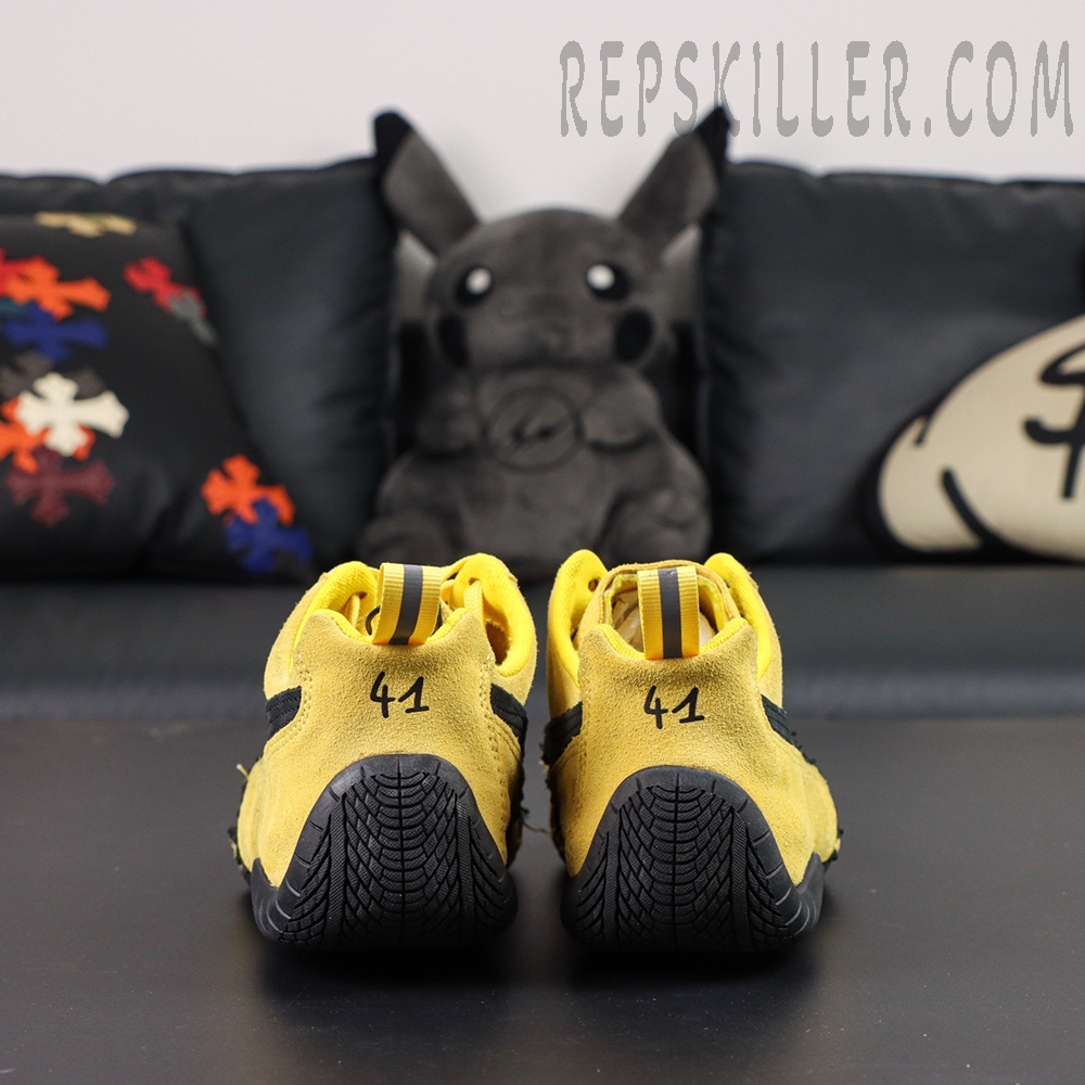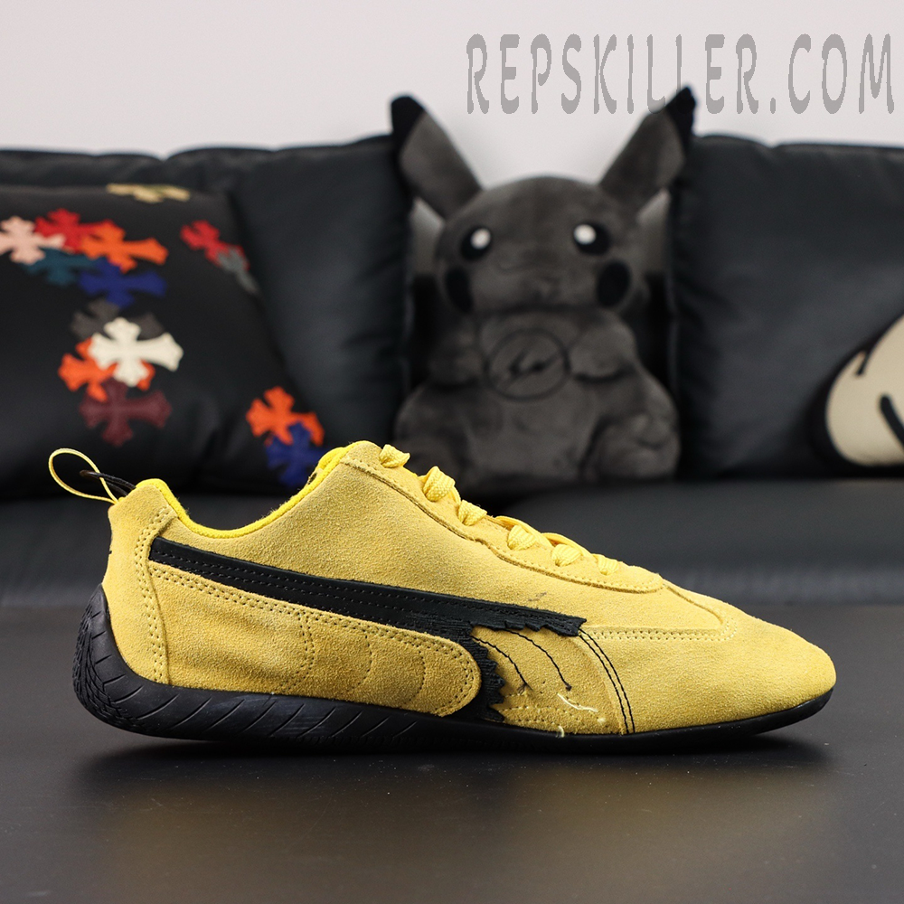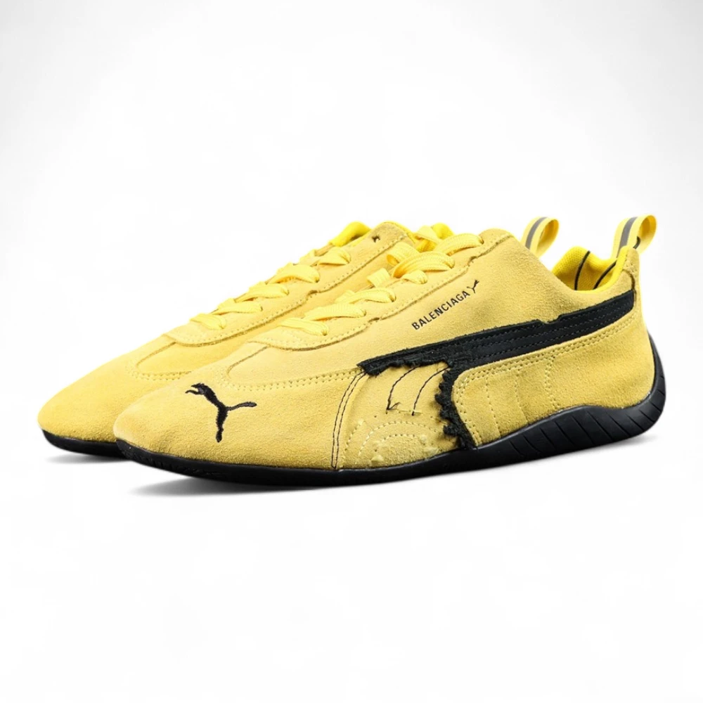 The Speedcat Suede Balenciaga in Yellow/black reinvents the sleek racing silhouette with bold attitude and high-fashion grit. Coated in a vibrant yellow suede upper, the shoe balances vintage motorsport styling with Balenciaga’s signature deconstructed logo elements. Black accents, including a ripped formstrip and co-branded embroidery, add dynamic contrast to this statement piece.