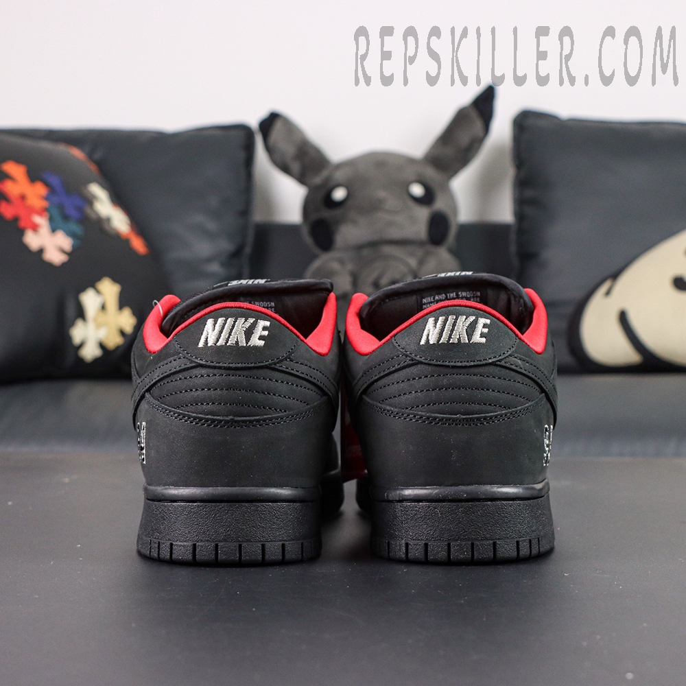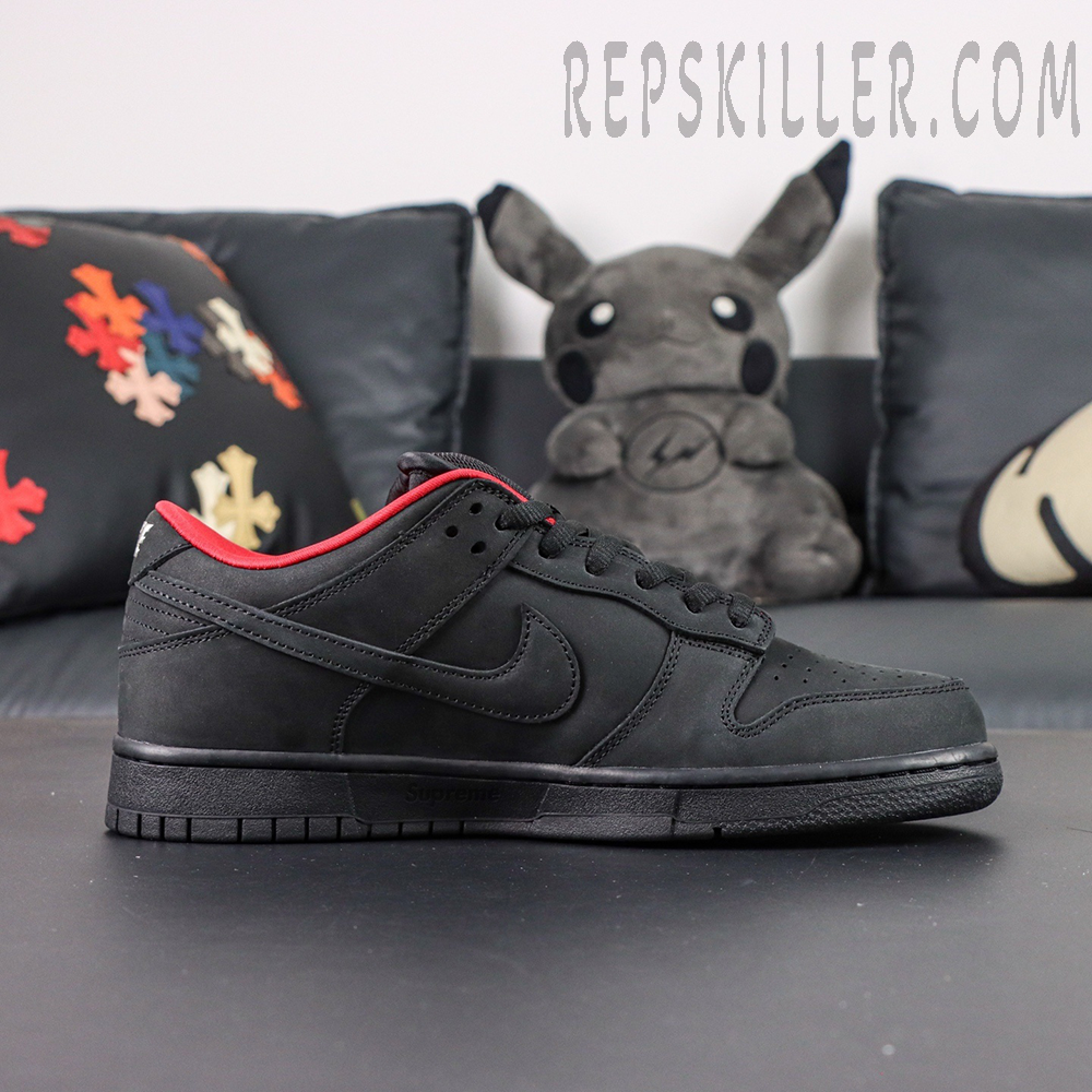 The Sup x Dunk Low SB “Black” reunites the two brands for a sleek, understated edition of the retro classic. The sneaker features a black nubuck upper with a contrasting red textile lining for a bold interior accent. Branding details include a Nike SB tongue tag, Nike embroidery on the heel tab, and a “94” logo stitched on the lateral heel as a tribute to Sup’s founding year. The black rubber midsole carries an etched Sup logo along the sidewall, completing the look with subtle sophistication and street-ready style.