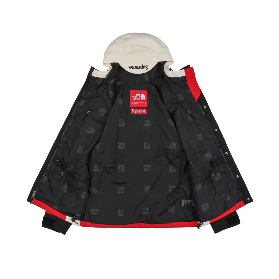 The Sup x TNF Expedition Jacket Red/White merges iconic mountaineering aesthetics with bold streetwear flair. Crafted from durable GORE-TEX® fabric, this jacket ensures waterproof and windproof protection while maintaining breathability. The striking red-and-white color blocking enhances its visual impact, complemented by multiple logo patches from both Sup and TNF. Adjustable hood, Velcro cuffs, and functional zip pockets complete this versatile outerwear, designed for both city exploration and outdoor challenges.