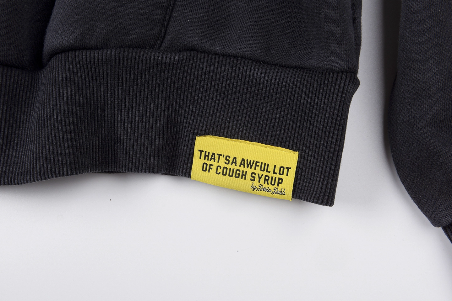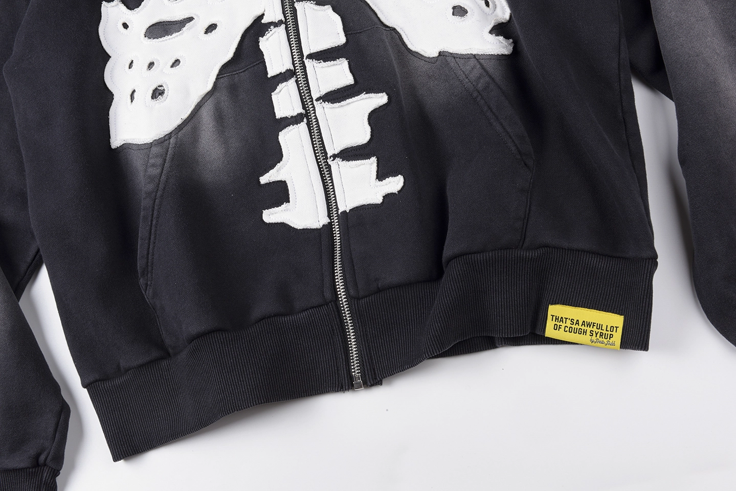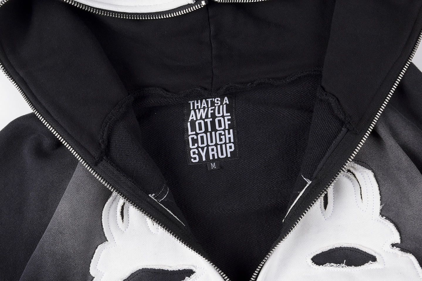 The That’s A Awful Lot of Cough Syrup Skeleton Print Full Zip Hoodie – Black delivers an edgy, rebellious look with its bold full-back typography and full-front skeleton illustration. Designed in a washed black finish with standout white prints, this hoodie features a split-zip skeleton face across the hood and chest, creating a striking visual when fully zipped. The structured ribbed cuffs, hem, and kangaroo pockets offer comfort and utility, while the yellow woven patch adds a signature streetwear touch. A statement piece made for those who walk the line between fashion and attitude.