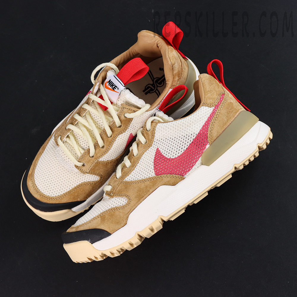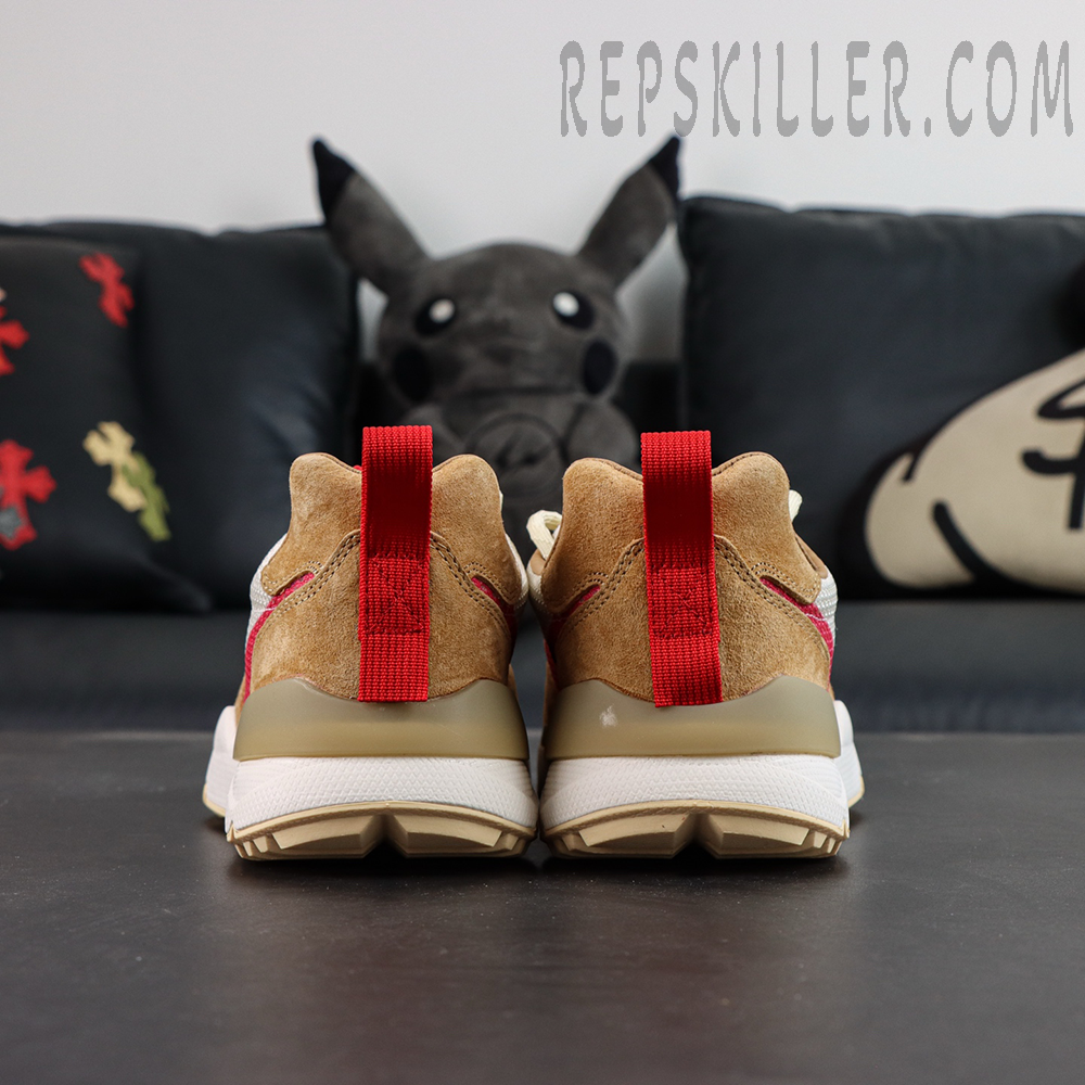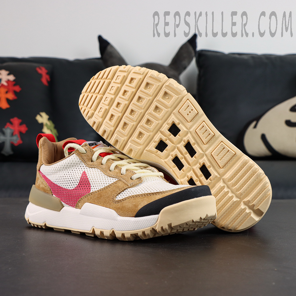 The upper is constructed from breathable off-white mesh, reinforced with beige suede overlays for structure and abrasion resistance. A printed red Swoosh delivers a bold visual contrast, while the updated lacing system provides a secure and adjustable fit. A black TPU toe cap enhances durability in high-wear areas, reinforcing the shoe’s utilitarian design language. Crimson pull tabs on the tongue and heel allow for easy on and off.