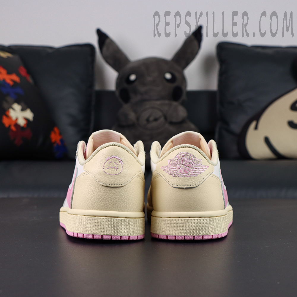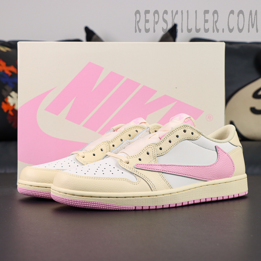 The upper combines muslin-toned leather with light grey panels, highlighted by a textured pink reverse Swoosh that defines the lateral side. Cream laces, aged-style midsoles, and soft pink outsole accents reinforce the vintage aesthetic, while precise stitching and panel alignment reflect the craftsmanship expected from top-tier Travis Scott reps and Jordan 1 Low reps. Signature Cactus Jack branding appears on the tongue and heel, completing the collaboration’s authentic look.