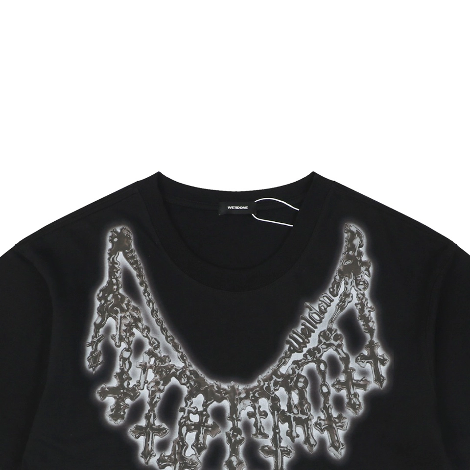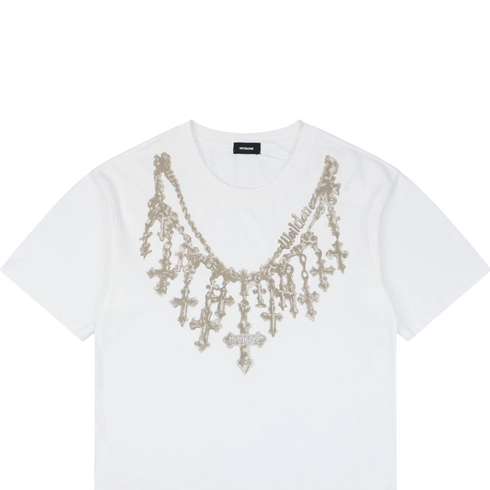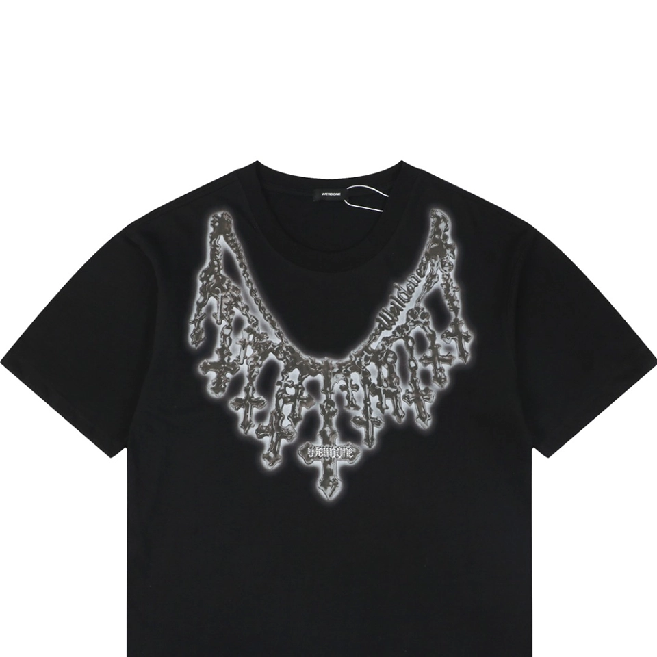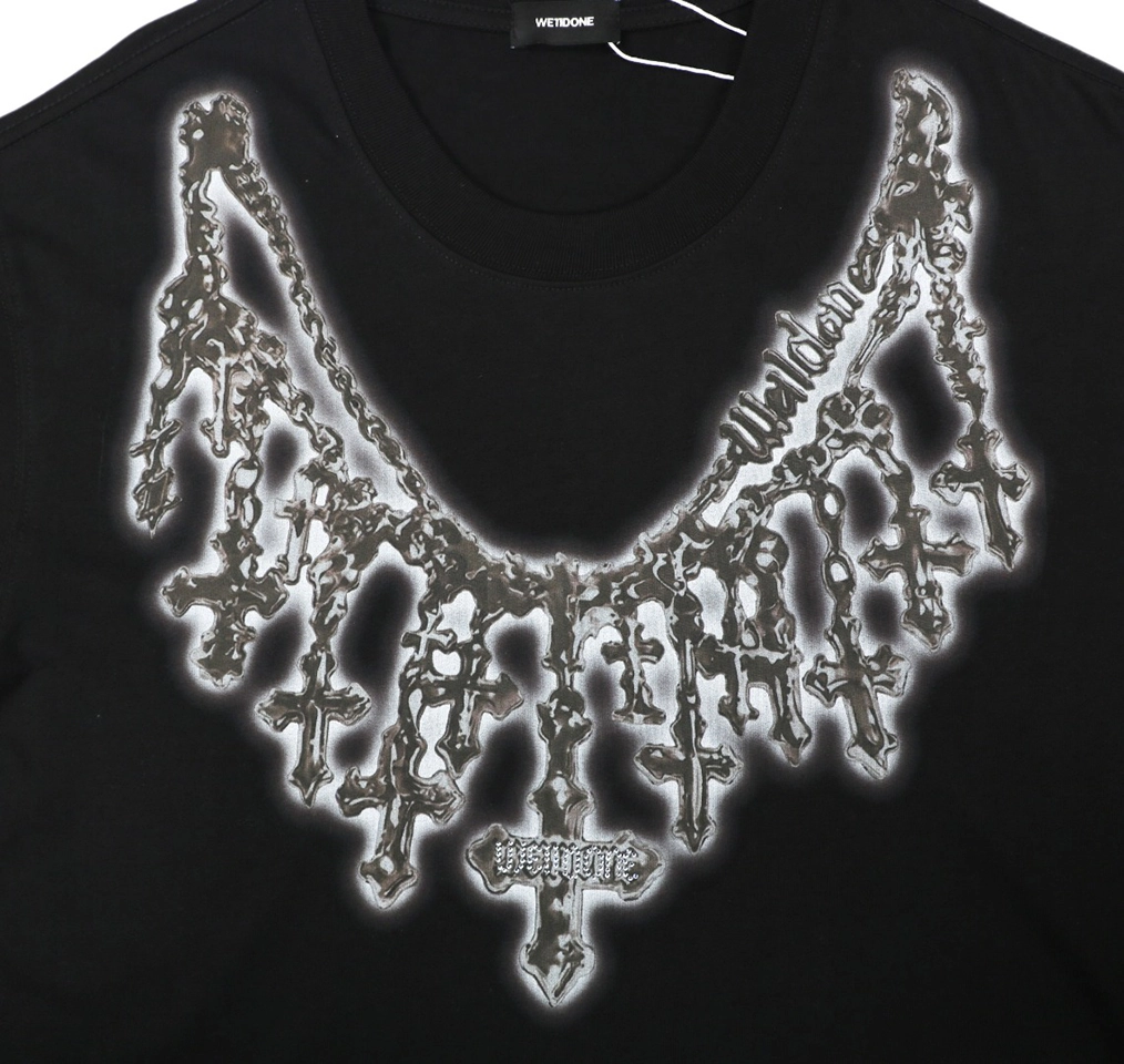 The We11done Cross Necklace Graphic T-Shirt features a bold necklace-inspired graphic that creates the illusion of layered cross pendants draped across the chest. The detailed design blends gothic-inspired jewelry aesthetics with modern streetwear, giving the piece a distinctive visual impact.