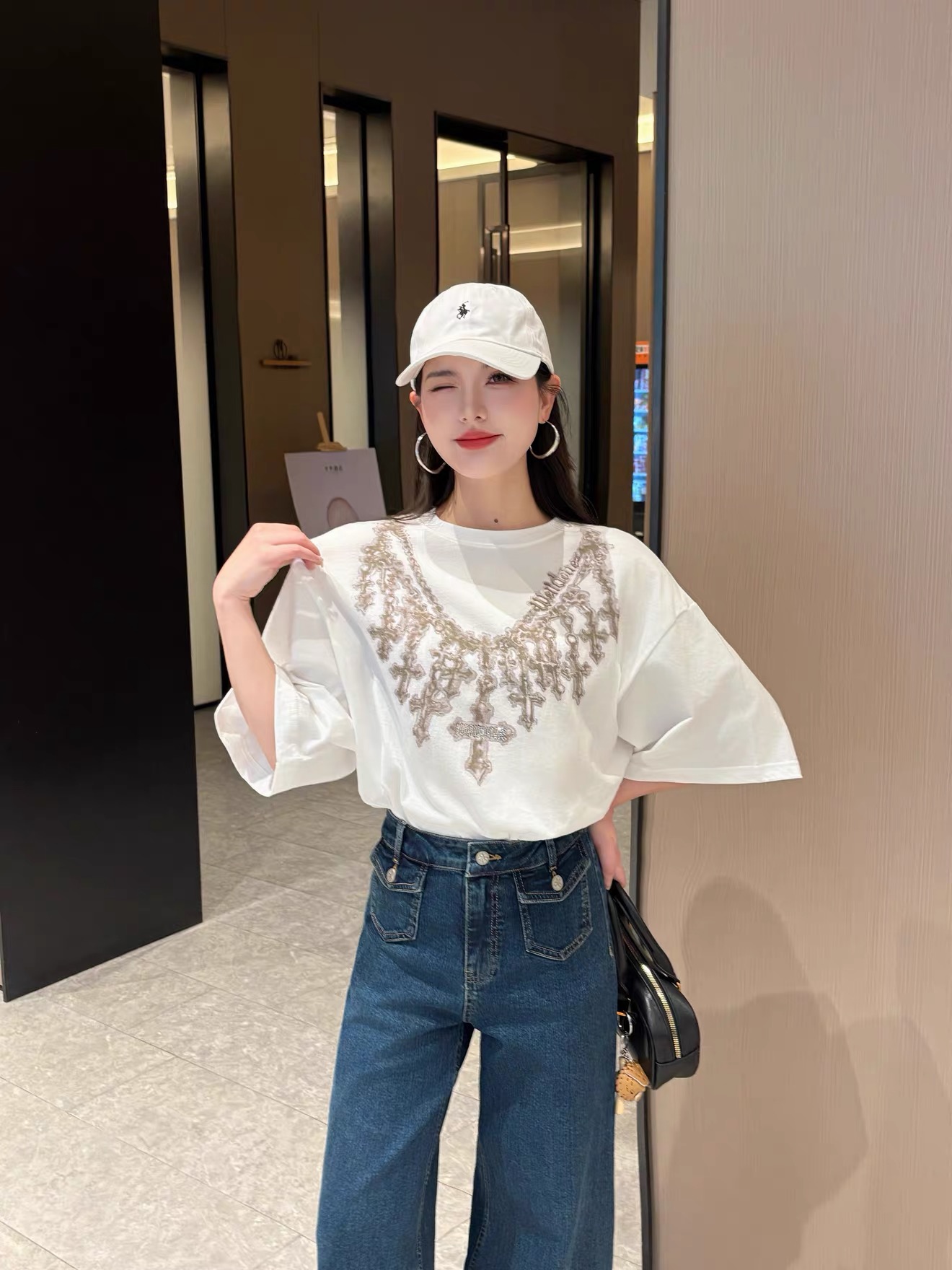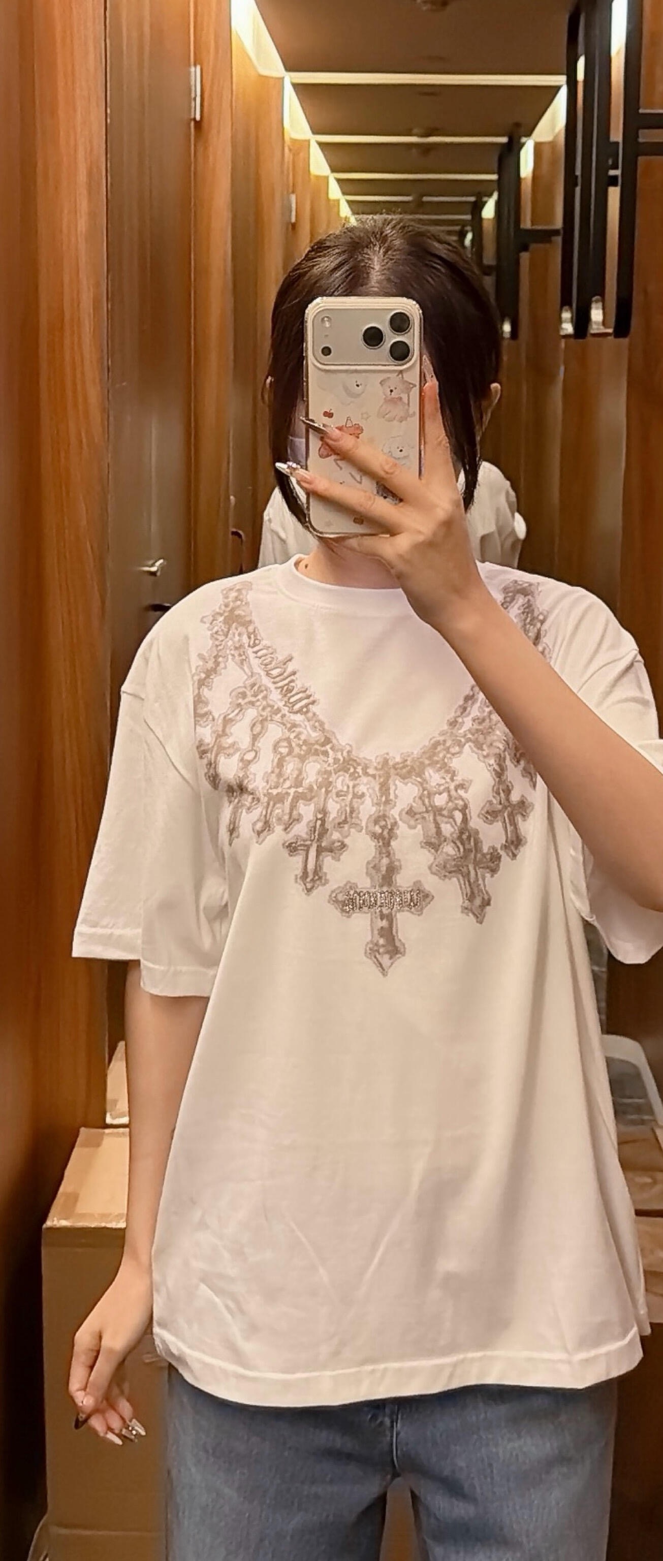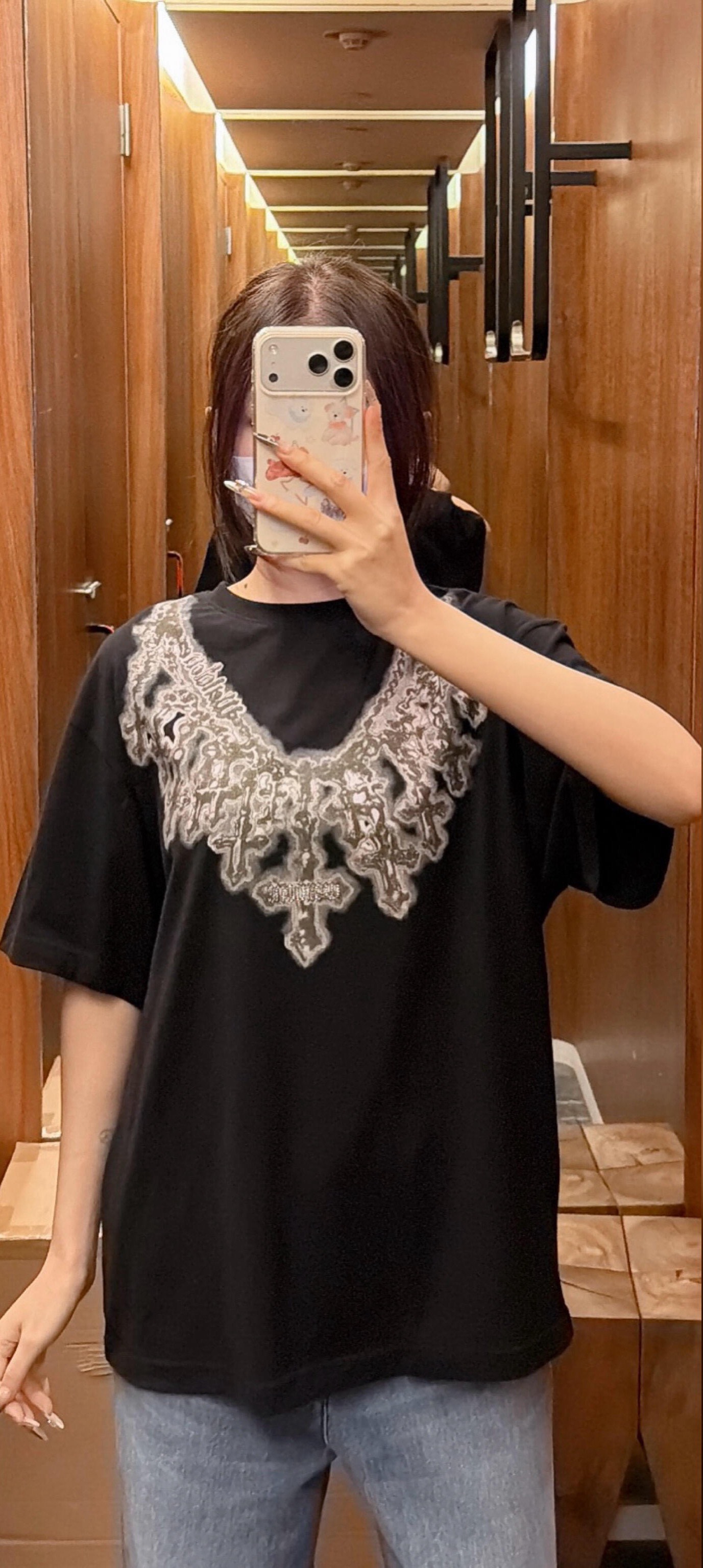 The We11done Cross Necklace Graphic T-Shirt features a bold necklace-inspired graphic that creates the illusion of layered cross pendants draped across the chest. The detailed design blends gothic-inspired jewelry aesthetics with modern streetwear, giving the piece a distinctive visual impact.