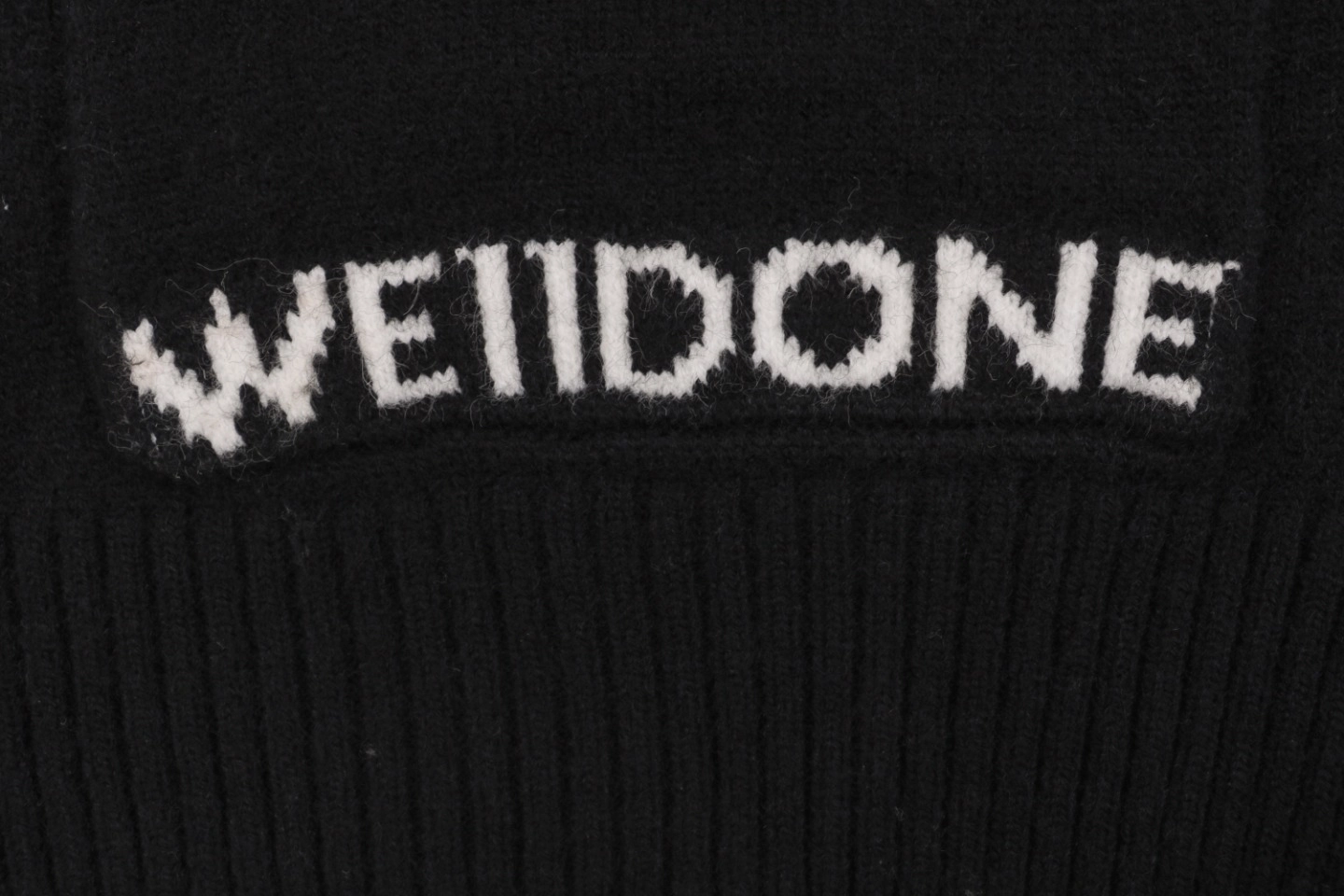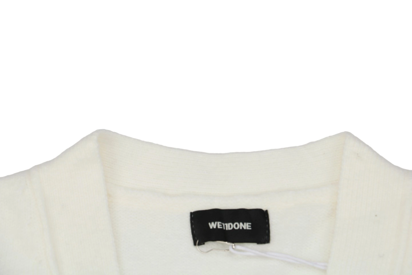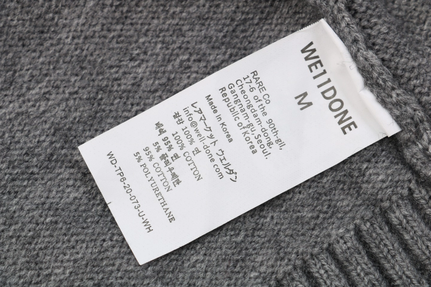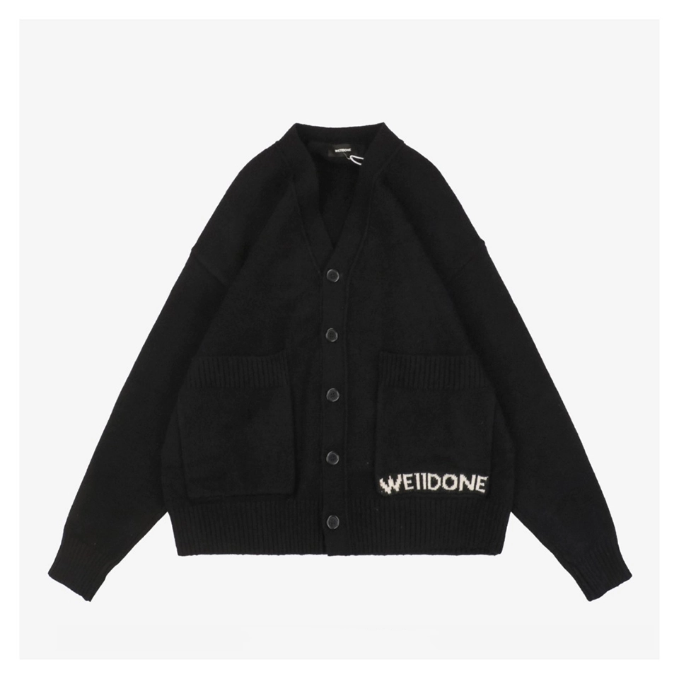 The We11done Pocket Hem “W” Cardigan is crafted from a premium blended yarn that offers a soft, smooth touch with dependable warmth and strong anti-pilling performance. Knitted using an imported seamless flat knitting machine, the cardigan features full rolled edges and requires over 90 minutes of machine time per piece to ensure refined structure and high-end texture. Both the raw panel and finished garment undergo dual washing processes to secure shape retention and enhance comfort. Designed with signature We11done “W” lettering at the hem and functional front pockets, the cardigan delivers subtle detail and modern character. Its relaxed silhouette provides excellent drape and versatility, making it an easy layering piece for the fall and winter seasons.