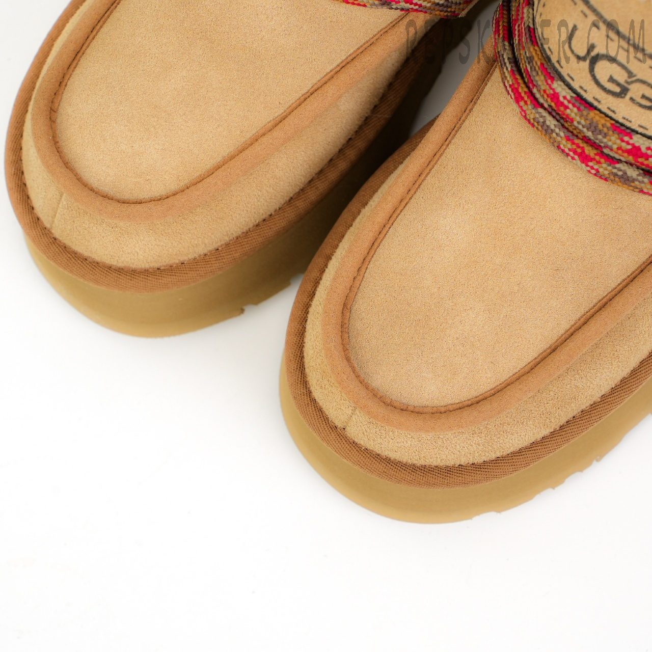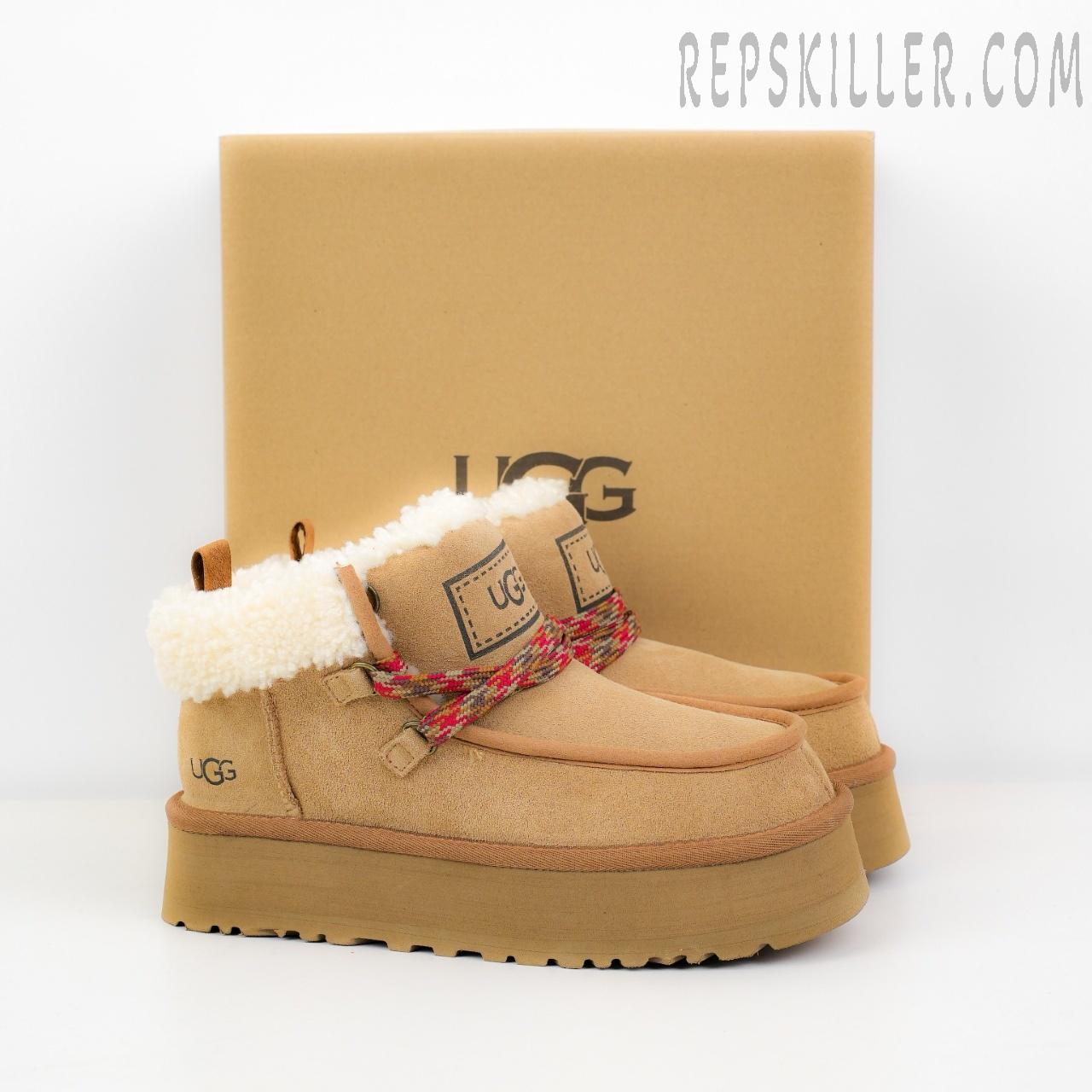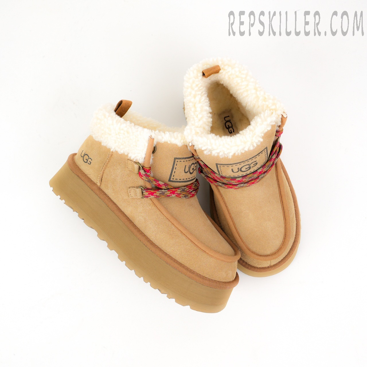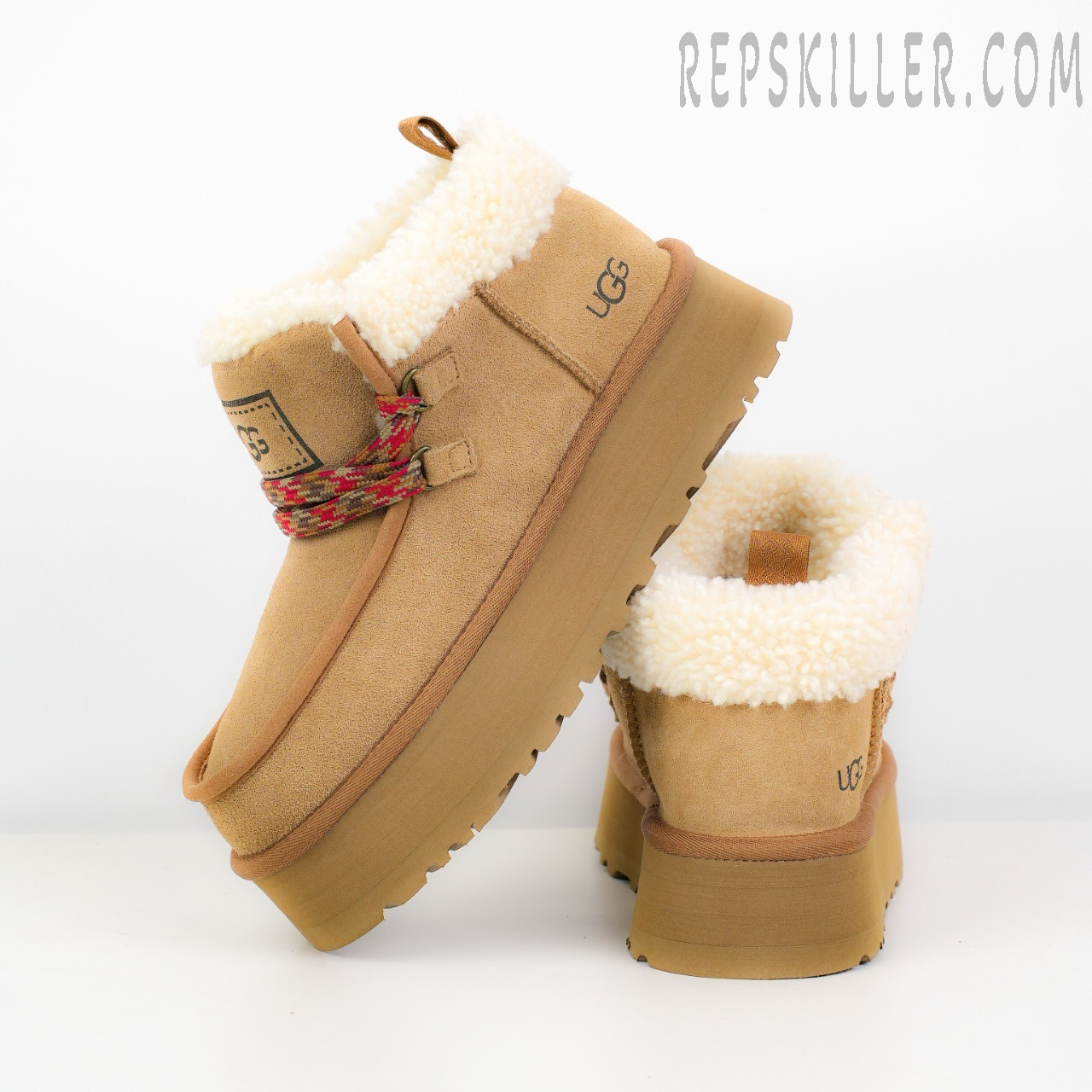 The UG*G Funkarra Cabin Cuff blends the structure of a shoe with the comfort of a slipper, featuring a bold 1.5” platform for an elevated look. Statement laces highlight the fixed cuffed collar and asymmetrical top line, adding unique character. Crafted from soft suede with a cozy UG*Gplush™ upcycled wool liner, it offers plush comfort and warmth. The outsole is made from renewable, rainwater-nourished sugarcane, reducing reliance on petroleum-based EVA while keeping every step lightweight and sustainable.
