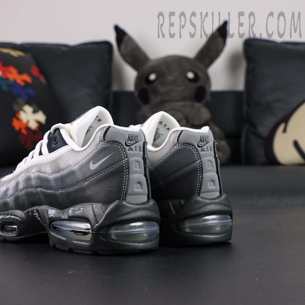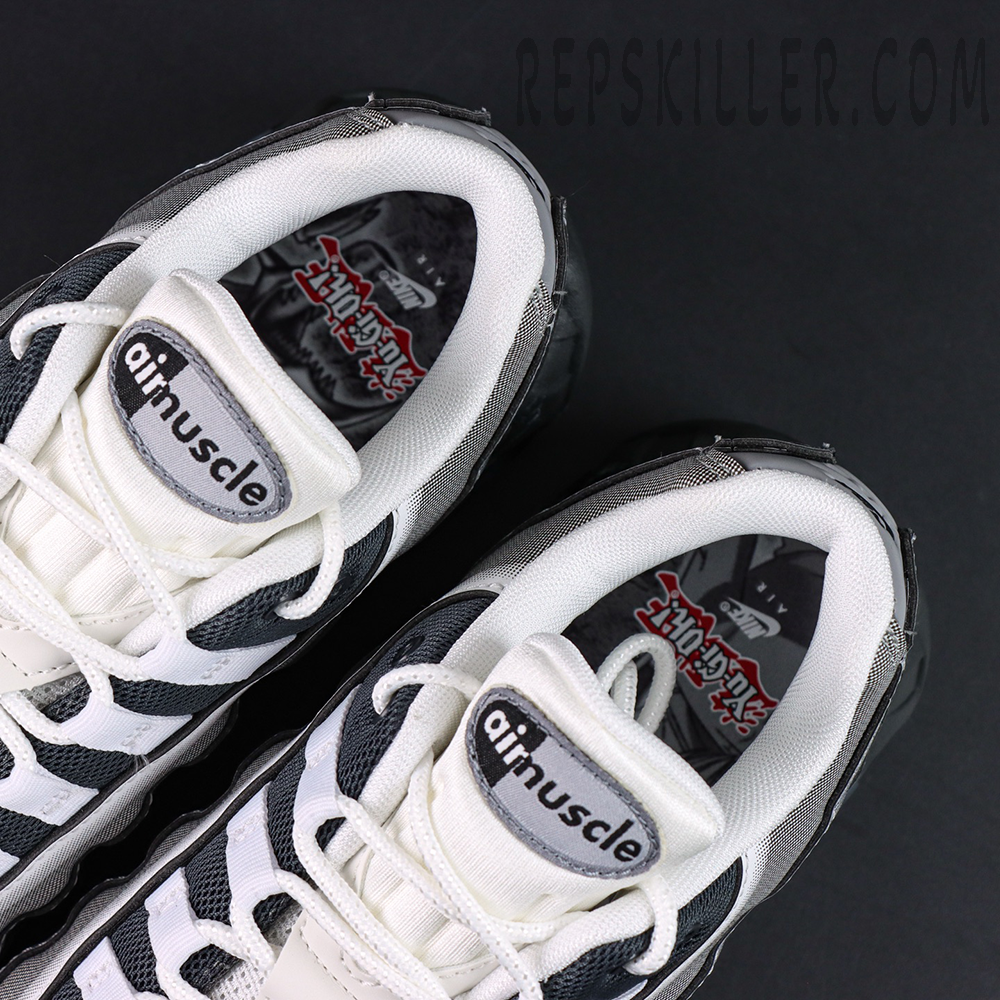 The upper is dressed in a refined greyscale palette, combining breathable mesh with layered synthetic and textile panels that echo the iconic wavy lines of the Air Max 95. The muted tones reflect the early black-and-white manga aesthetic, while subtle detailing elevates the shoe’s premium feel. A custom “Air Muscle” embroidered tongue tag nods to the special-edition status, reinforcing its appeal within the designer sneaker reps and anime collab sneaker market.